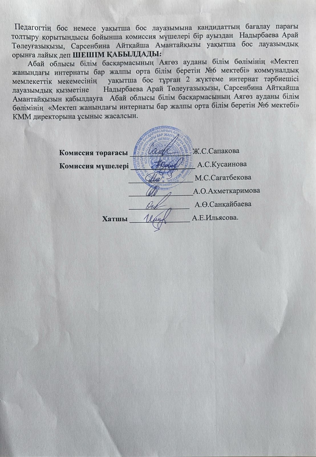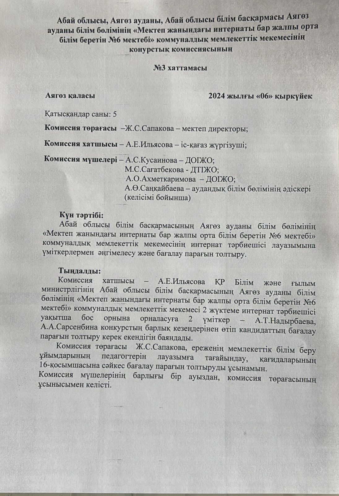 Абай облысы білім басқармасының Аягөз ауданы білім бөлімінің «Мектеп жанындағы интернаты бар жалпы орта білім беретін № 6 мектебі»