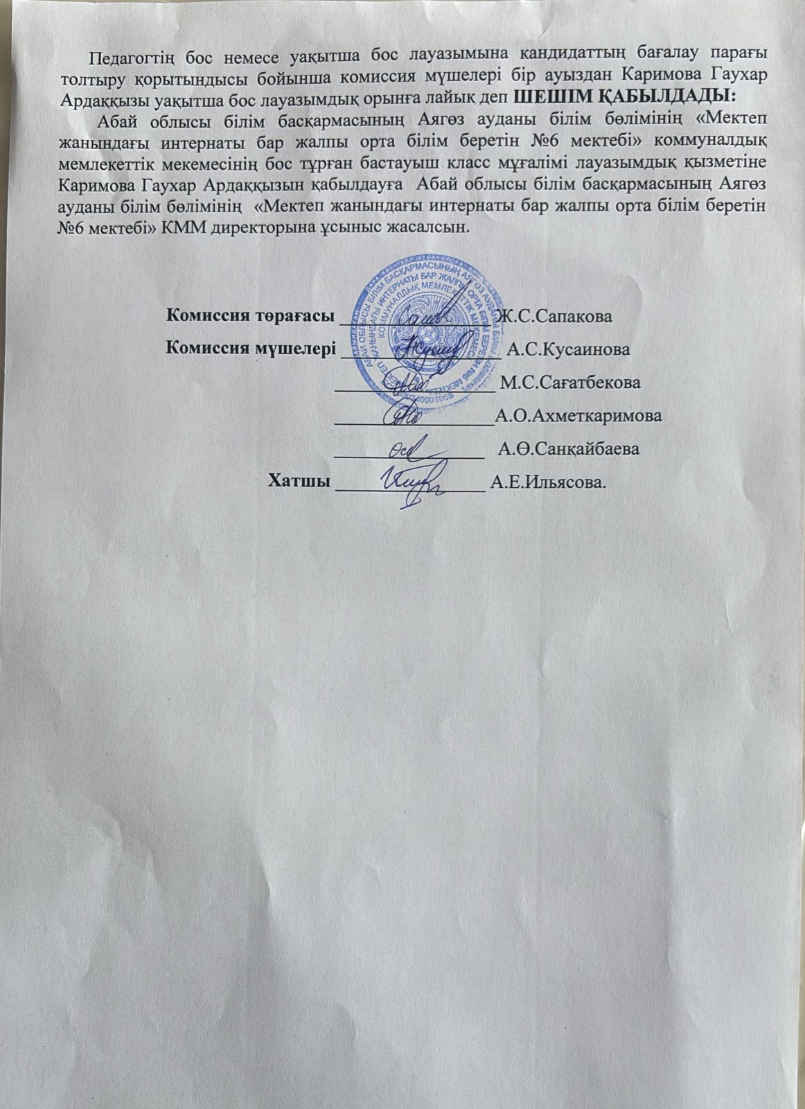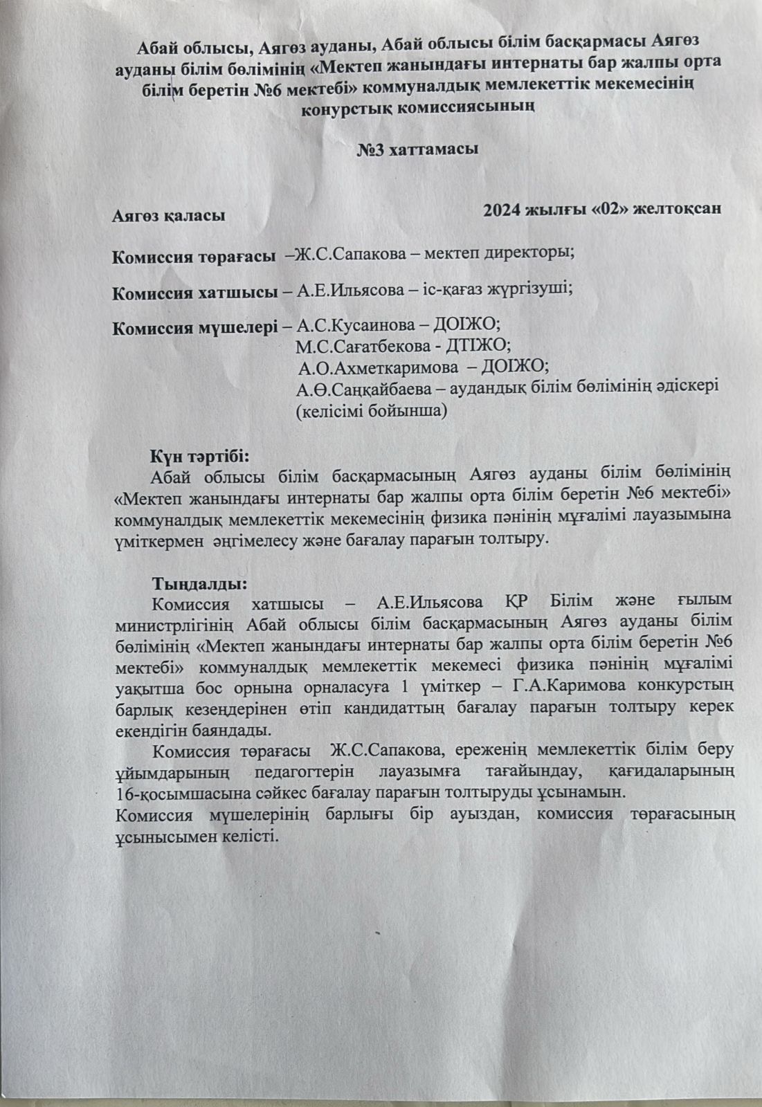 Абай облысы білім басқармасының Аягөз ауданы білім бөлімінің «Мектеп жанындағы интернаты бар жалпы орта білім беретін № 6 мектебі»