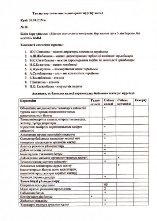 Тамақтану сапасына мониторинг актісі.Хаттамасы