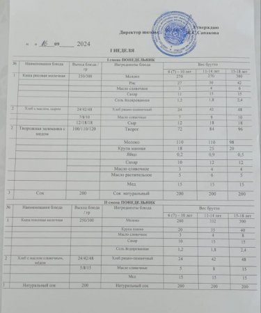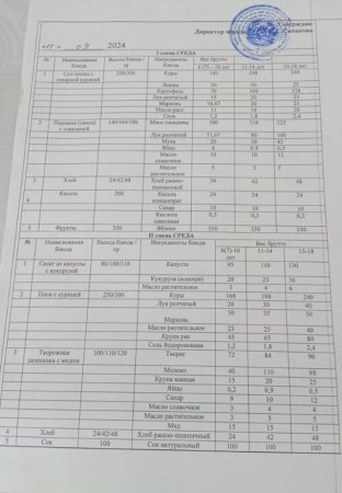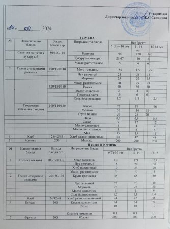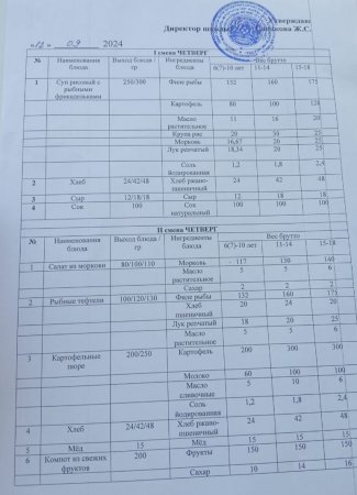 Күн мәзіріне берілетін ыстық тамақ 12.09.2024ж