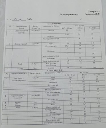 Күн мәзіріне берілетін ыстық тамақ 17.09.2024ж