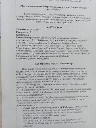 Тамақтану сапасының мониторинг жүргізу актісі.Хаттамасы