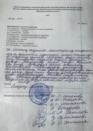 Абай облысы, Аягөз ауданы, "Мектеп жанындағы интернаты бар жалпы орта білім беретін №6 мектебі" КММ-де Барлық жұмыстар уақытылы жүргізіліп отыр.Комиссия құрылып, тексеріс жұмыстары жүріп жатыр. Актлер мен мониторигті және хаттамалар толтырылған.