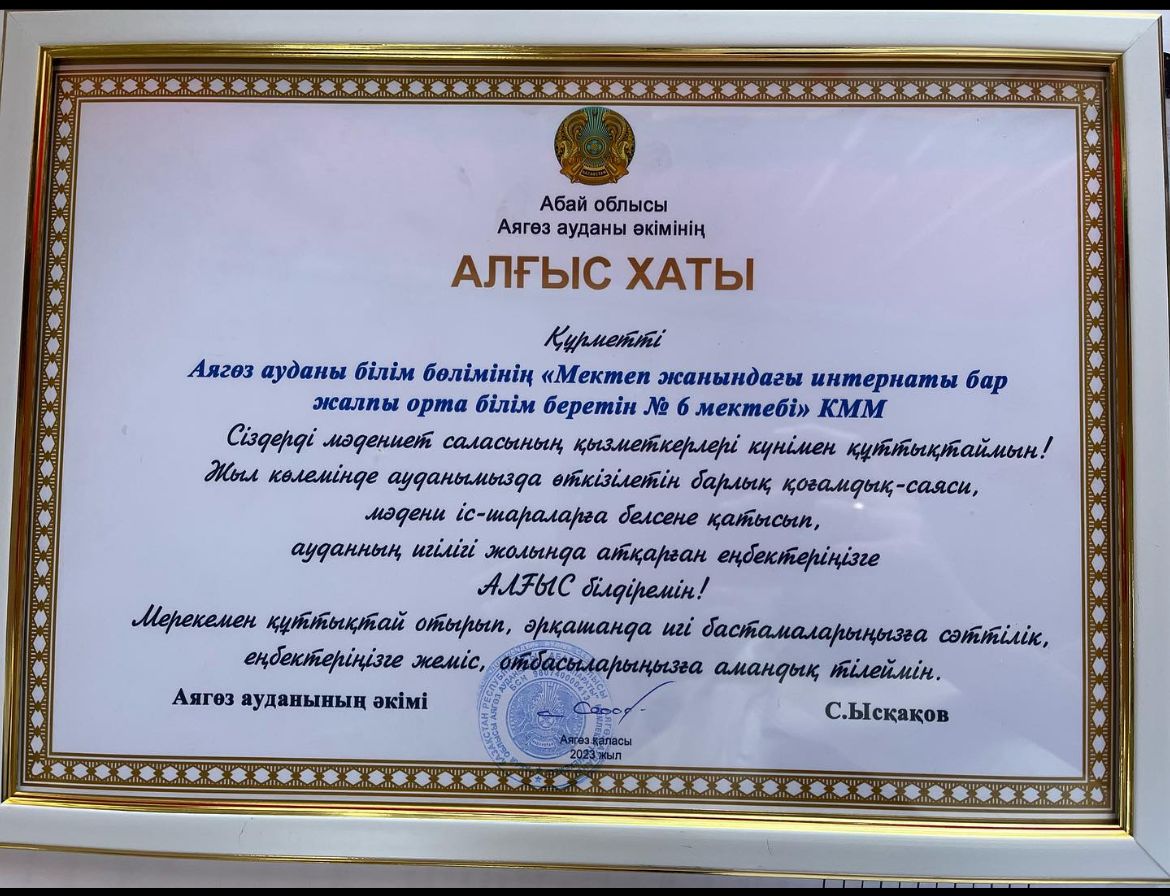 Жыл көлемінде ауданымызда өткізілген барлық қоғамдық - саяси , мәдени іс- шараларға белсене қатысқаны үшін “Мектеп жанындағы интернаты бар жалпы орта білім беретін #6 мектебі” КММ , Аягөз ауданының әкімі С.Ысқақовтың алғыс хатымен марапатталды.Мектебіміздің еңбегі еленіп, мәртебесі арта берсін.