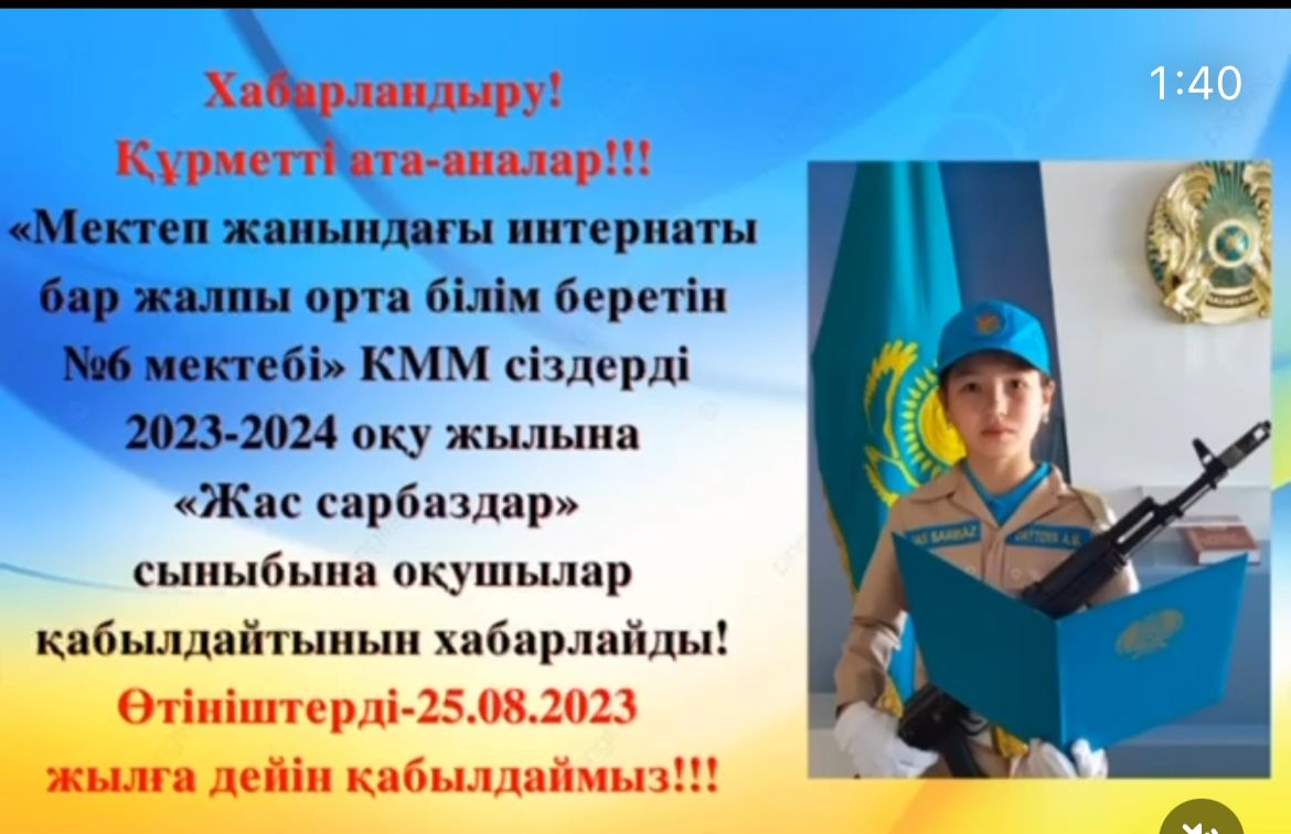 Хабарландыру!!! Құрметті ата аналар!!! «Мектеп жанындағы интернаты бар жалпы орта білім беретін №6 мектеп» КММ сіздерді 2023-2024оқу жылына «Жас сарбаздар» сыныбына оқушылар қабылдайтынын хабарлайды! Өтініштерді-25.08.2023 жылға дейін қабылдаймыз!!