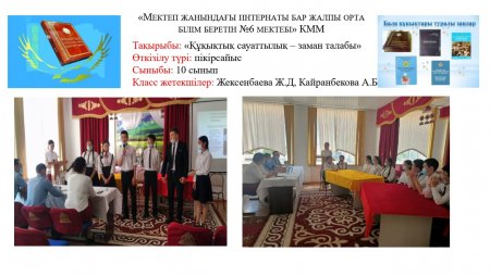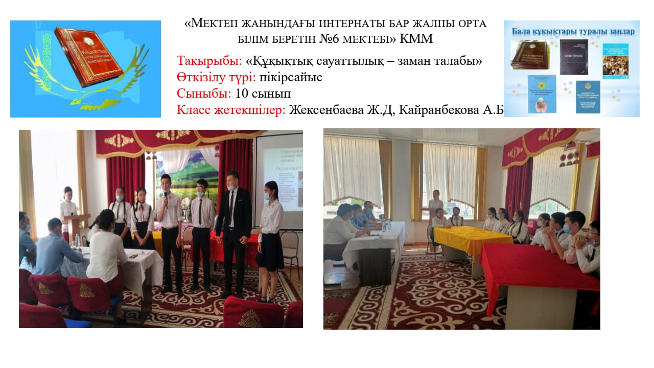 31 мамыр күні 1 маусым- Халықаралық балаларды қорғау күніне орай ШҚО Аягөз ауданы «Мектеп жанындағы интернаты бар жалпы орта білім беретін №6 мектебі» КММ-де 10 сыныптар арасында «Құқықтық күзет » ІІІ блогы бойынша «Құқықтық сауаттылық-заман талабы» тақырыбында пікірсайыс өткізілді. Пікір сайыстың мақсаты: Оқушылардың құқықтық сауаттылығын арттыру. Ата заңымызға деген сүйіспеншілік сезімін қалыптастырып, шыншыл да әділетті және парасатты тұлғаны қалыптастыру.