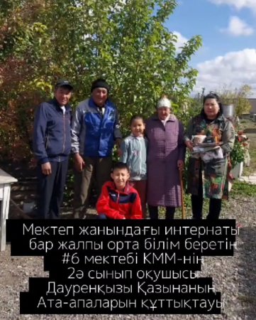 1 Қазан-Халықаралық қарттар күні мерекесіне орай “Мектеп жанындағы интернаты бар жалпы орта білім беретін №6 мектебі” КММ-ның оқушылары “Қарттарымызды қуантайық” акциясын өткізді.”Қарттарын қадірлеген ел ардақты” дегендей қарттарымызды мерекелерімен құттықтап, ата-әжелердің көңілдерінен шыға білді.Мерекелік іс-шара шеңберінде ардагерлер оқушыларымызға алғыстарын айтып, баталарын берді.Үлкендерден бата алып, қарттарымызды ардақтап өтейік.