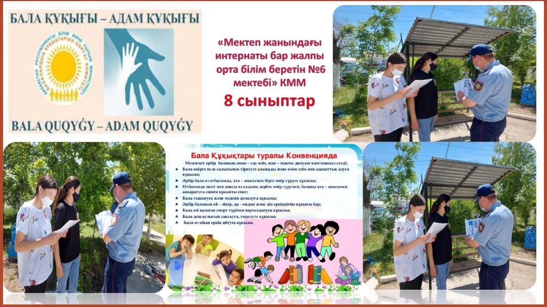 «Мектеп жанындағы интернаты бар жалпы орта білім беретін № 6 мектебі» КММ1 Маусым - Балаларды қорғау күніне орай балалардың қоғам өміріне қатысу құқығын іске асыру, қазақстандық қоғамның өмірін жақсартуға бағытталған идеяларды таныстыру білігін қалыптастыру мақсатында IV блок «Балалар бастауы» республикалық қоғамдық тыңдалулар конкурстар өтілді. Аягөз ауданының ішкі істер бөлімінің полиция аға лейтенанты Қажығалиев Ерзат Ерғалиұлынан оқушылар сұхбат алды.
