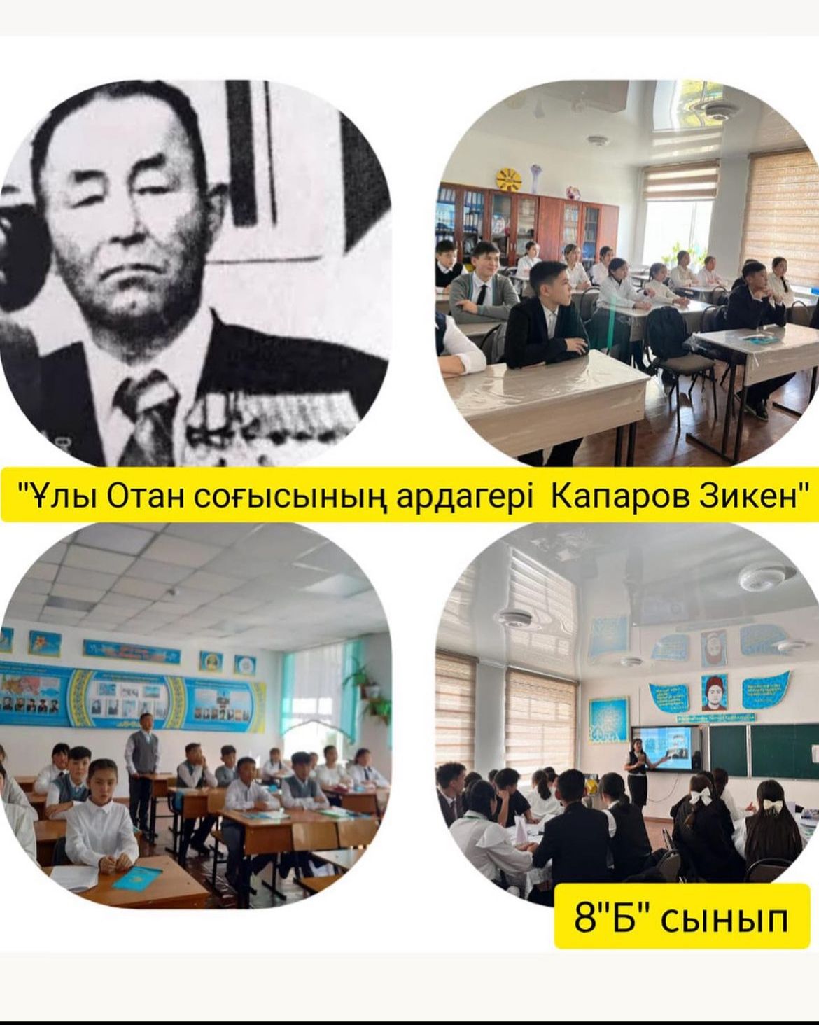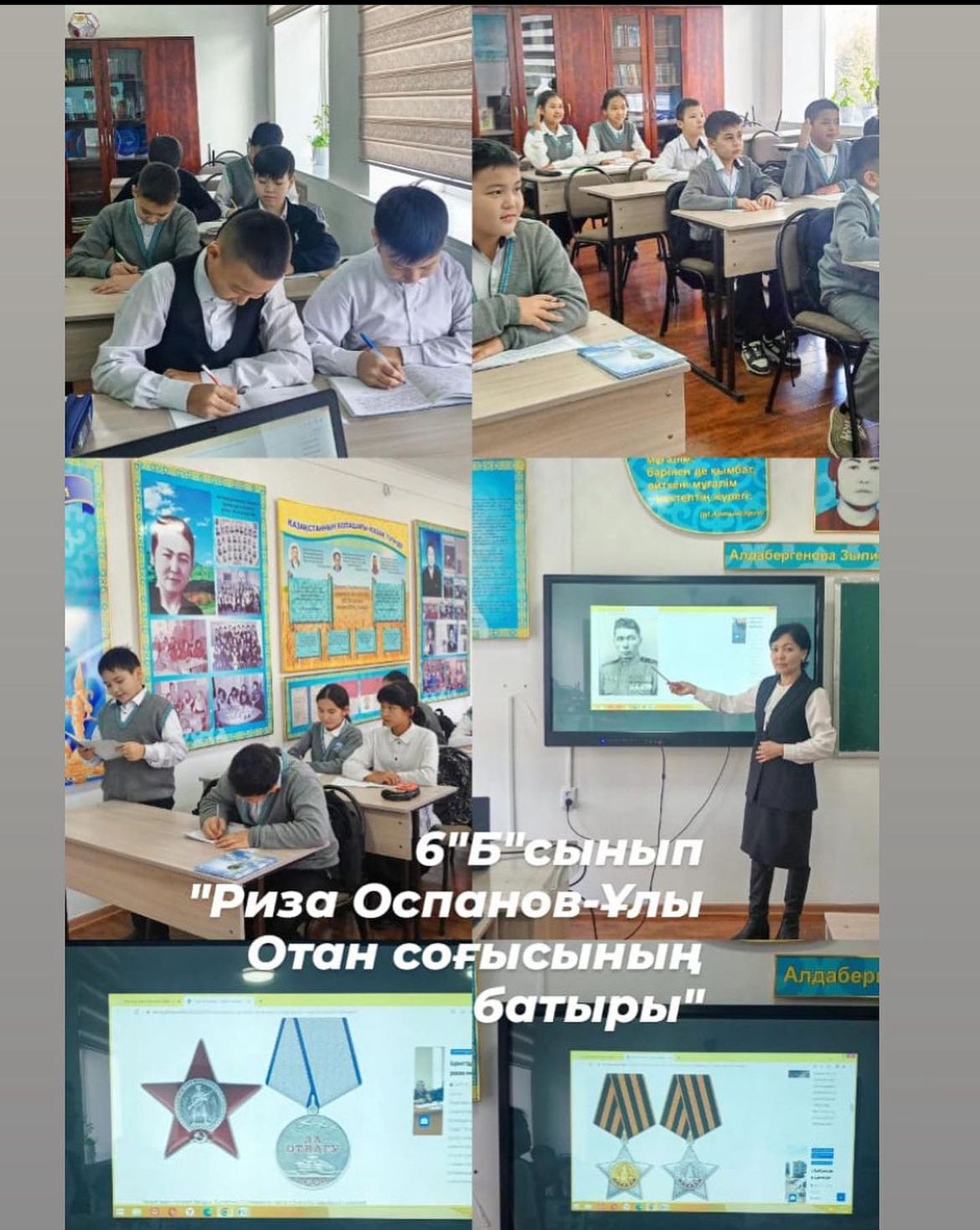 Абай облысы білім басқармасы Аягөз ауданы білім бөлімінің «Мектеп жанындағы интернаты бср жалпы орта білім беретін #6 мектебі» КММ-де майдангерлердің есімін мәңгілікке қалдыру, сондай-ақ олардың ерлік істерін үлгі ету арқылы жастарға әскери-патриоттық тәрбие беру мақсатында Ұлы Отан соғысының батырлары Риза Оспанов және Капаров Зикен ардагерлеріміз жайлы танымдық сағат өткізілді.Сынып жетекшілер: Рамазанова Ж.Р.