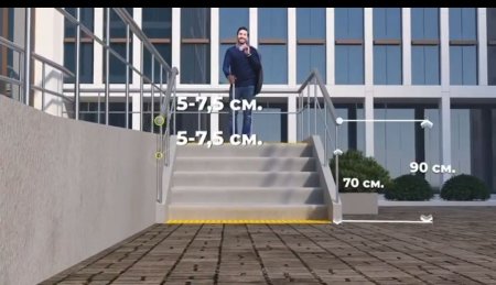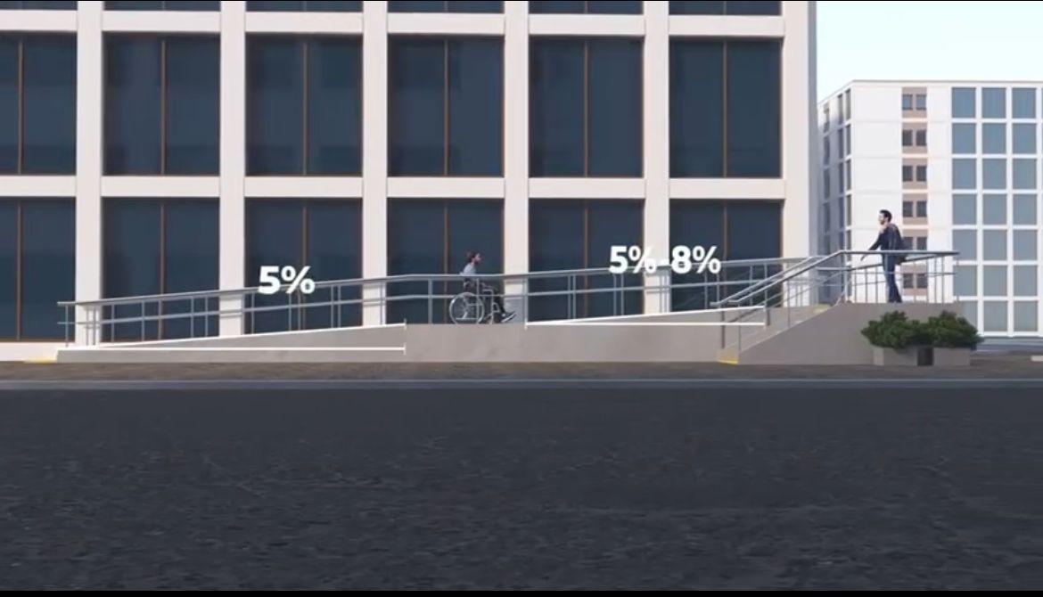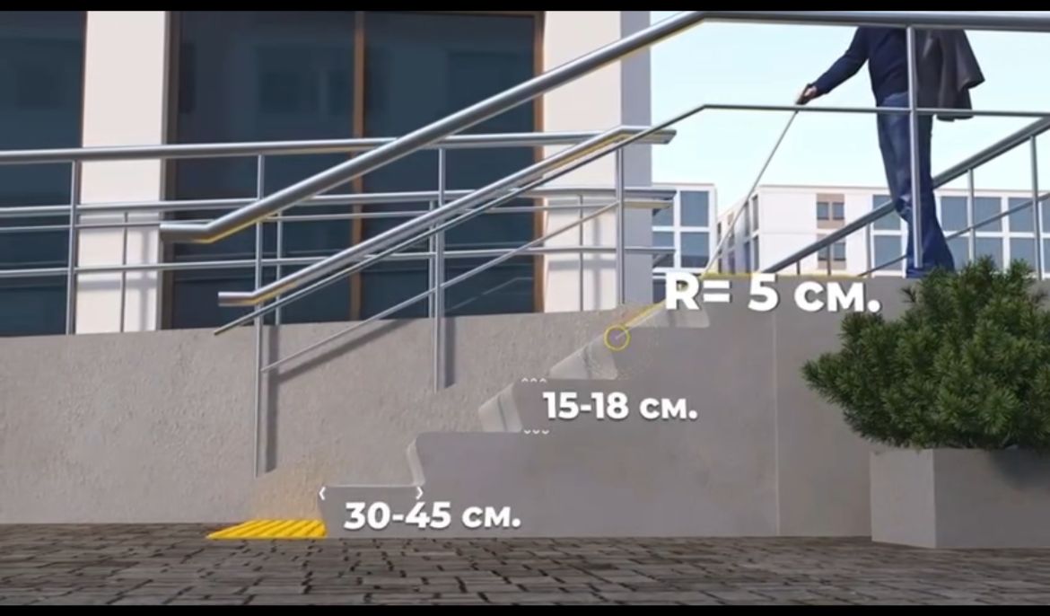 Ғимаратта қозғалу мүмкіндігі шектеулі адамдар үшін, бейімделген кемінде бір кіре беріс болуы керек.Онда сыртқы баспалдақтармен пандустар нормативті құжаттарға сәйкес, стационарлық тірек құрылғыларына қойылатын техникалық талаптар ескеріле отырып, тұтқалармен жабдықталады. Пандустың ені 5%-дан аспауы керек. Ерекше жағдайларда, тар жерлерде ең жоғары көтеру биіктігі 8%-дан аспайтын , 0,8 метрден аспауы керек.Халықтың жүріп тұруы шектеулі топтары қозғалу жолында баспалдақтардың сатылары тұтас шығыңқы жерлері жоқ және беті кедір-бұдырлы болуы керек.Баспалдақтардың шеті 5 см-ден аспайтын радиусы бар дөңгелекке ие болуы керек. Ал бүйірлік жиектердің биіктігі кемінде 2 см болатын жақтары болуы керек.Баспалдақтардың ені кемінде 30-40 см болуы керек.