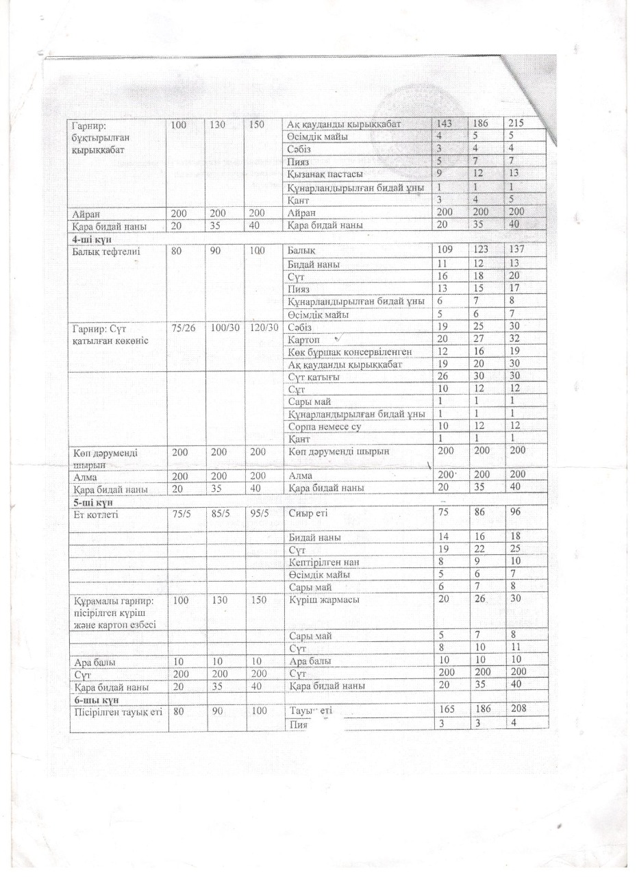 | 8 | Құжаттардың тізбесі | көрсетілетін қызметті берушіге: 1) өтініш; 2) ата-аналардың жеке басын куәландыратын құжат (жеке басын сәйкестендіру үшін қажет); 3) "АХАЖ тіркеу пункті" ақпараттық жүйесінде мәліметтер болмаған жағдайда (бұдан әрі - АХАЖ АЖ) не Қазақстан Республикасынан тыс жерде туылған жағдайда баланың туу туралы куәлігінің көшірмесі (жеке сәйкестендіру үшін қажет); 4) АХАЖ АЖ-де мәліметтер болмаған жағдайда не Қазақстан Республикасынан тыс жерде некеге тұрған немесе бұзған жағдайда некеге тұру немесе бұзу туралы куәліктің көшірмесі; 5) мәртебесін растайтын құжаттың көшірмесі: мемлекеттік атаулы әлеуметтік көмекті алуға құқығы бар отбасылардан шыққан балалар үшін - көрсетілетін қызметті алушының (отбасының) жергілікті атқарушы органдар ұсынатын мемлекеттік атаулы әлеуметтік көмекті тұтынушылар қатарына жататынын растайтын анықтама; жан басына шаққанда орташа табысы күн көріс деңгейінен төмен, мемлекеттік атаулы әлеуметтік көмек алмайтын отбасылардан шыққан балалар үшін - алған табысы туралы құжаттар (жұмыс істейтін ата-аналардың немесе оларды алмастыратын адамдардың жалақылары туралы, кәсіпкерліктен және басқа да қызмет түрлерлерінен түсетін табыстары туралы, балаларға және басқа да асырауындағыларға төленетін алимент түріндегі табыстары туралы анықтама); отбасында тәрбиеленетін жетім балалар, ата-анасының қамқорлығынсыз қалған балалар үшін - жетім балалар мен ата-анасының қамқорлығынсыз қалған, отбасыда тәрбиеленетін балалар үшін қорғаншылықты (қамқоршылықты), патронаттық тәрбиелеуді бекіту туралы уәкілетті органның шешімі; төтенше жағдайлардың салдарынан шұғыл көмекті талап ететін отбасылардан шыққан және білім беру ұйымының алқалы басқару органы айқындайтын білім алушылар мен тәрбиеленушілердің өзге де санаттарына жататын балалар үшін - отбасының материалдық-тұрмыстық жағдайын тексеру негізінде алқалы орган айқындайды. Құжаттар салыстыру үшiн түпнұсқада ұсынылады, содан кейiн түпнұсқалар көрсетілетін қызметті алушыға қайтарылады. порталда: 1) көрсетілетін қызметті алушының ЭЦҚ-сымен немесе бір рет пайдаланатын құпиясөзбен куәландырылған, көрсетілетін қызметті алушының ұялы байланыс операторы ұсынған абоненттік нөмірі порталдың есеп жазбасына тіркелген және қосылған жағдайда, электрондық құжат нысанындағы өтініш; 2) АХАЖ АЖ-де мәліметтер болмаған жағдайда не Қазақстан Республикасынан тыс жерде туылған жағдайда баланың туу туралы куәлігінің электрондық көшірмесі; 3) АХАЖ АЖ-де мәліметтер болмаған жағдайда не Қазақстан Республикасынан тыс жерде некеге тұрған немесе бұзған жағдайда некеге тұру немесе бұзу туралы куәліктің электрондық көшірмесі; 4) мәртебесін растайтын құжаттың электрондық көшірмесі: мемлекеттік атаулы әлеуметтік көмекті алуға құқығы бар отбасылардан шыққан балалар үшін - көрсетілетін қызметті алушының (отбасының) жергілікті атқарушы органдар ұсынатын мемлекеттік атаулы әлеуметтік көмекті тұтынушылар қатарына жататынын растайтын анықтама; жан басына шаққанда орташа табысы күн көріс деңгейінен төмен, мемлекеттік атаулы әлеуметтік көмек алмайтын отбасылардан шыққан балалар үшін - алған табысы туралы құжаттар (жұмыс істейтін ата-аналардың немесе оларды алмастыратын адамдардың жалақылары туралы, кәсіпкерліктен және басқа да қызмет түрлерлерінен түсетін 