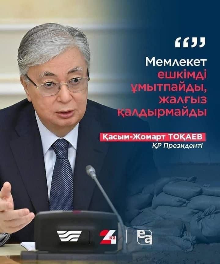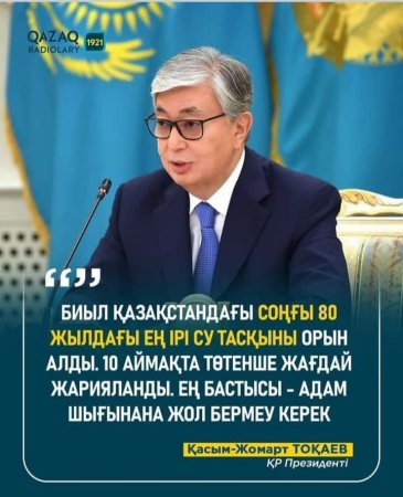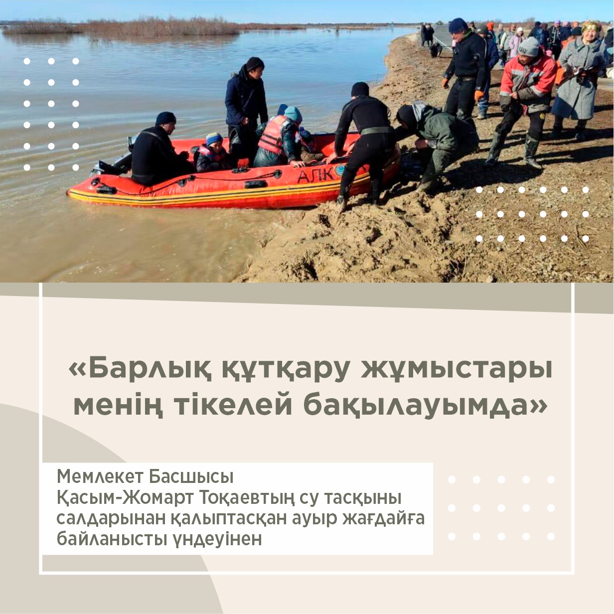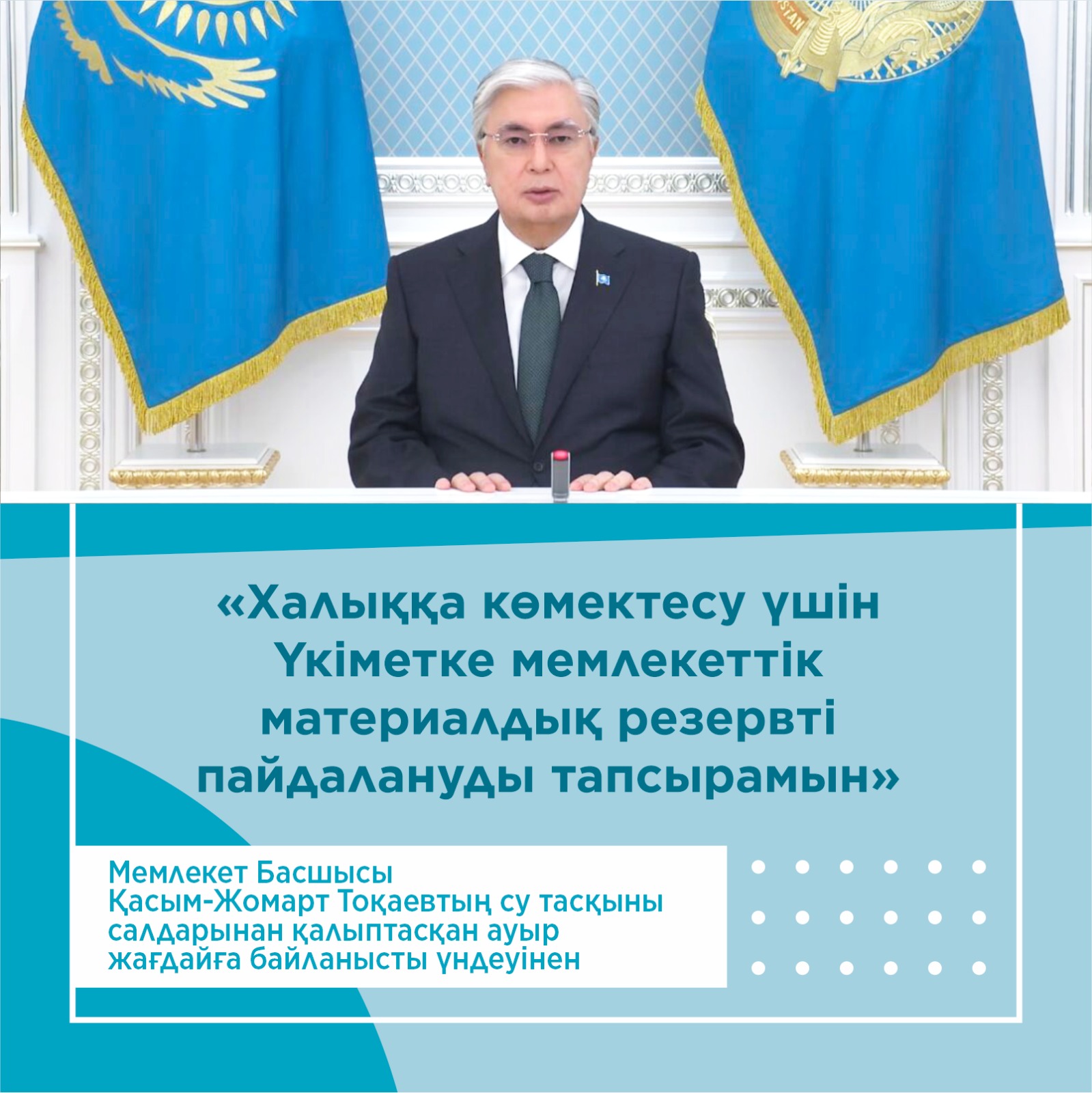 Президент елдегі су тасқынына байланысты үндеу жасады. «Жағдай өте күрделі болса да, біз қиындықты міндетті түрде еңсереміз, барлығын қалпына келтіреміз. Ең бастысы – азаматтардың амандығы. Тасқын судан зардап шеккен азаматтарға айтарым, мемлекет бірде-бір адамды ескерусіз қалдырмайды. Баршаңызға қаржылық және басқа да көмек беріледі. Материалдық шығындар толық өтеледі. Біз алапат су тасқынынан тиісті қорытынды шығаруымыз керек» - деді Мемлекет басшысы