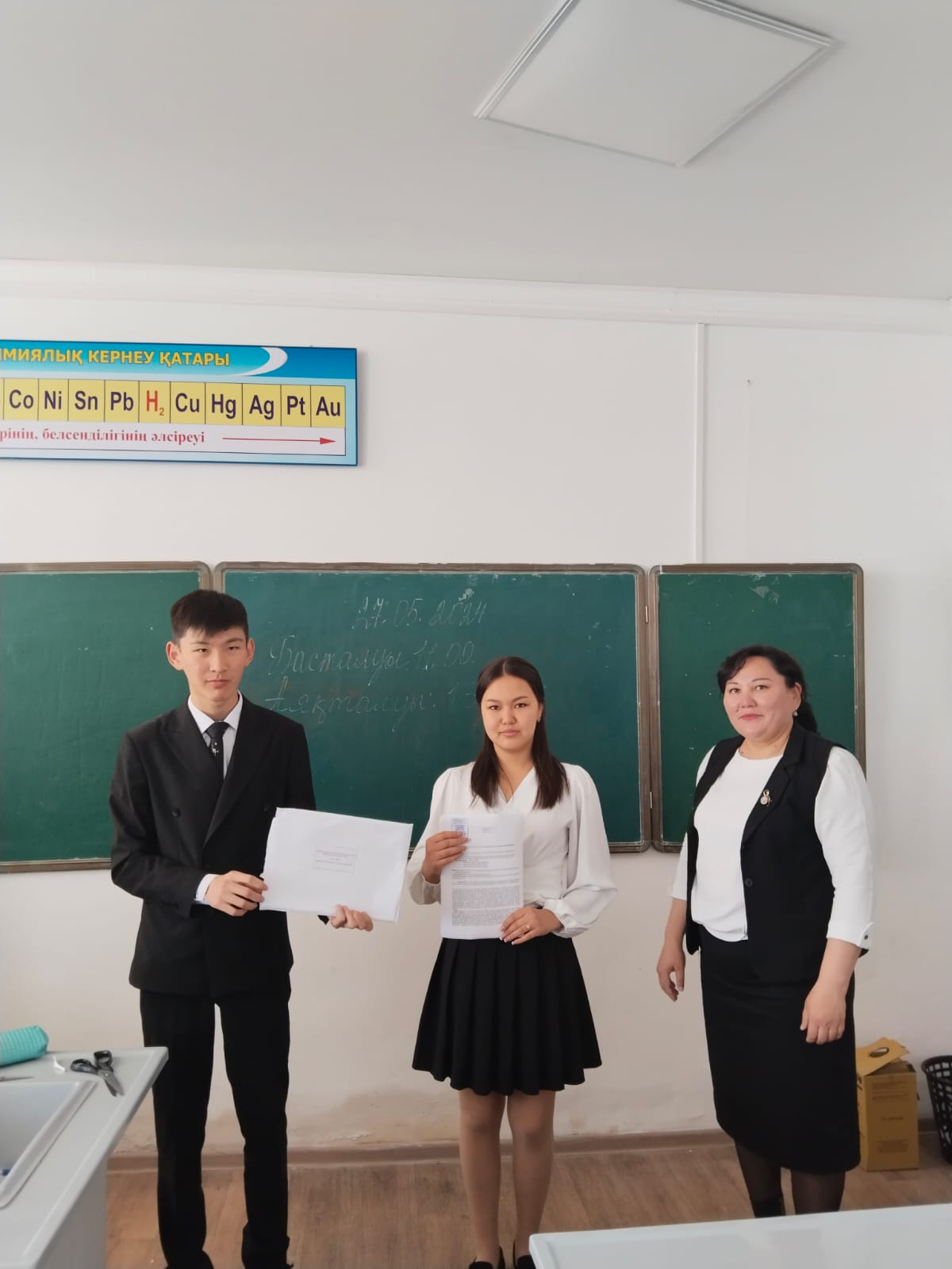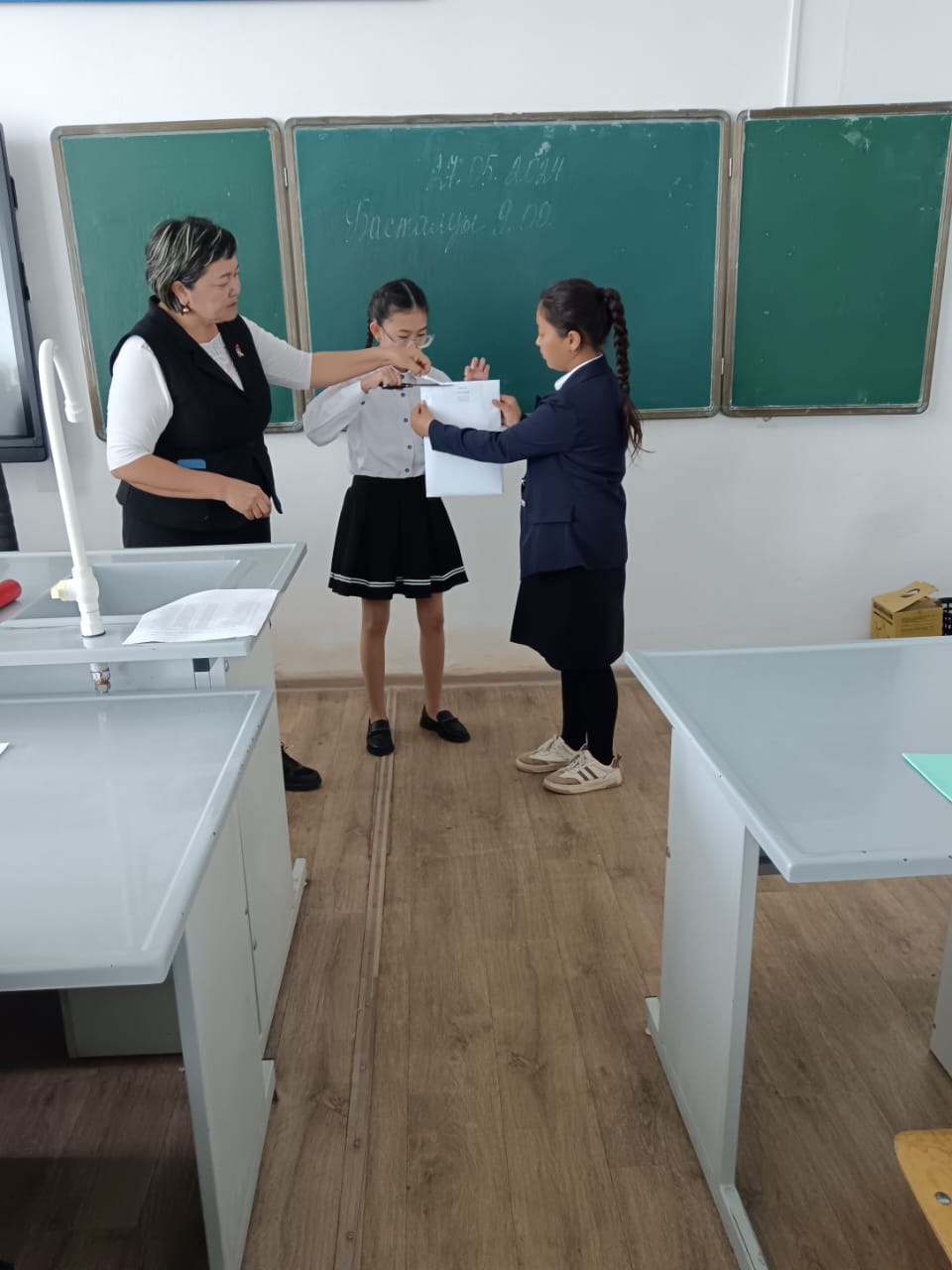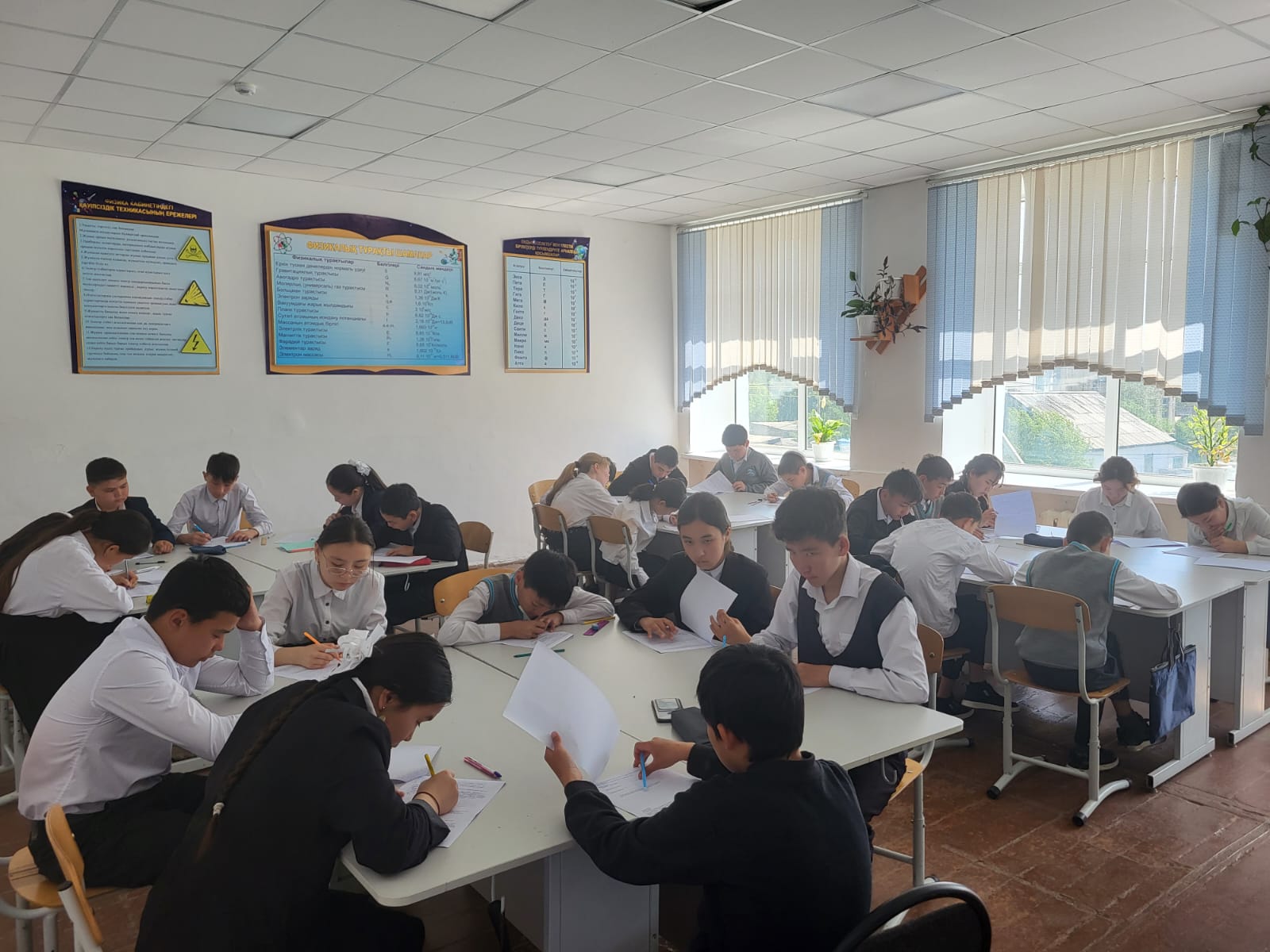 Қазақ тілі бойынша емтихан 128-бұйрықтың 35 тармағына сәйкес білім алушылардың бағдарлама мазмұнын меңгеруін бағалау мақсатында жазбаша нысанда жүргізілді.Жазбаша емтиханға 2 сағат уақыт бөлінді.Емтихан 9.00-де басталып, 10.00-де, сондай-ақ 11.00-де басталып, 13.00-де аяқталды.Емтиханға 314 оқушы қатысты.Емтихан басында оқушыларға мектеп директоры Ж.С.Сапакова сәттілік тілеп, оқу ісінің меңгерушісі А.О.Ахметкаримова емтихан өткізу талабымен таныстырды.Емтихан жұмыстары толықтай тексеріліп, хаттама толтырылды.