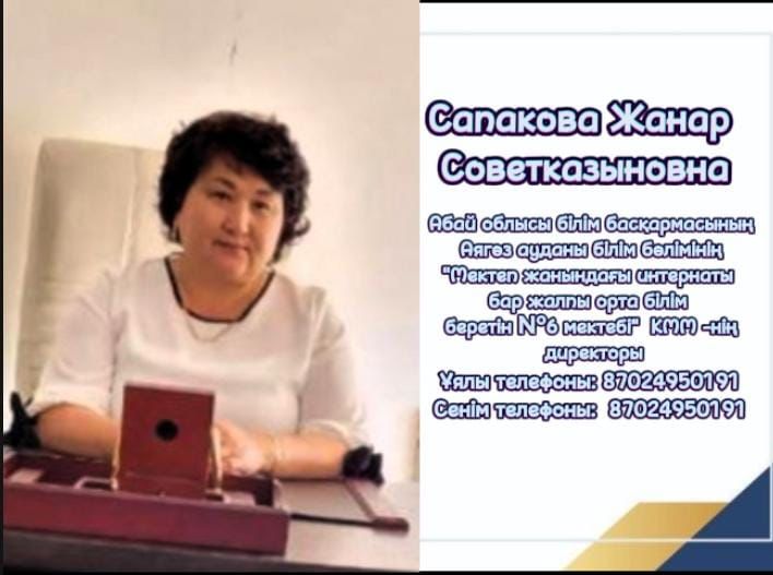 Абай облысы білім басқармасының Аягөз ауданы білім бөлімінің “Мектеп жанындағы интернаты бар жалпы орта білім беретін №6 мектебі” КММ-ның директоры Сапакова Жанар Советказыновна. Ұялы телефоны:87024950191 Сенім телефоны:87024950191