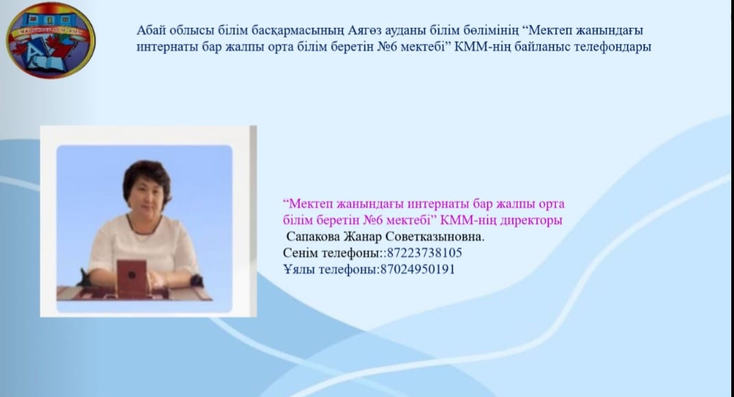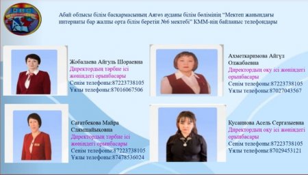 Мектеп сайты » Информация » Абай облысы білім басқармасының Аягөз ауданы білім бөлімінің “Мектеп жанындағы интернаты бар жалпы орта білім беретін №6 мектебі” КММ-нің байланыс телефондары