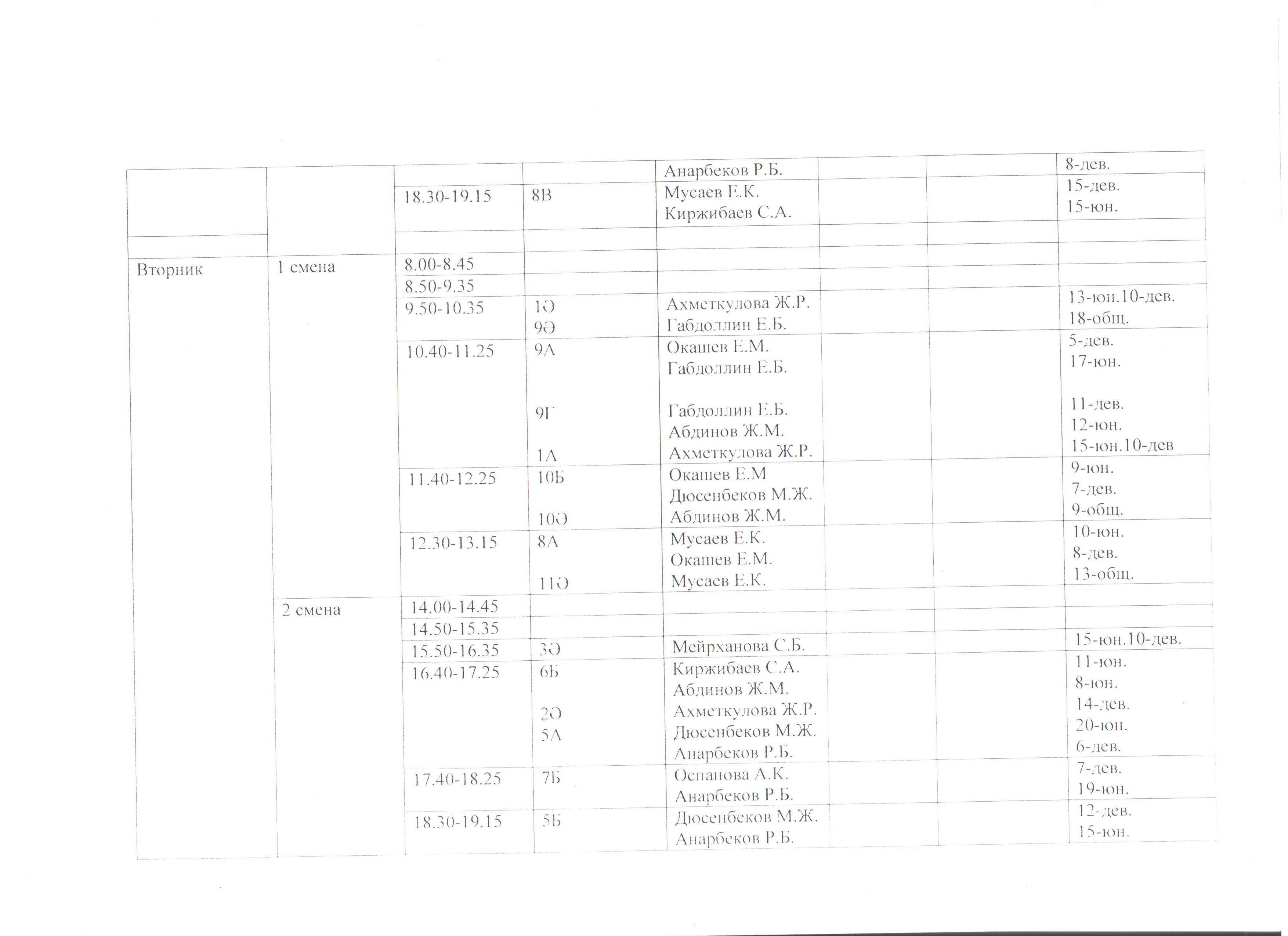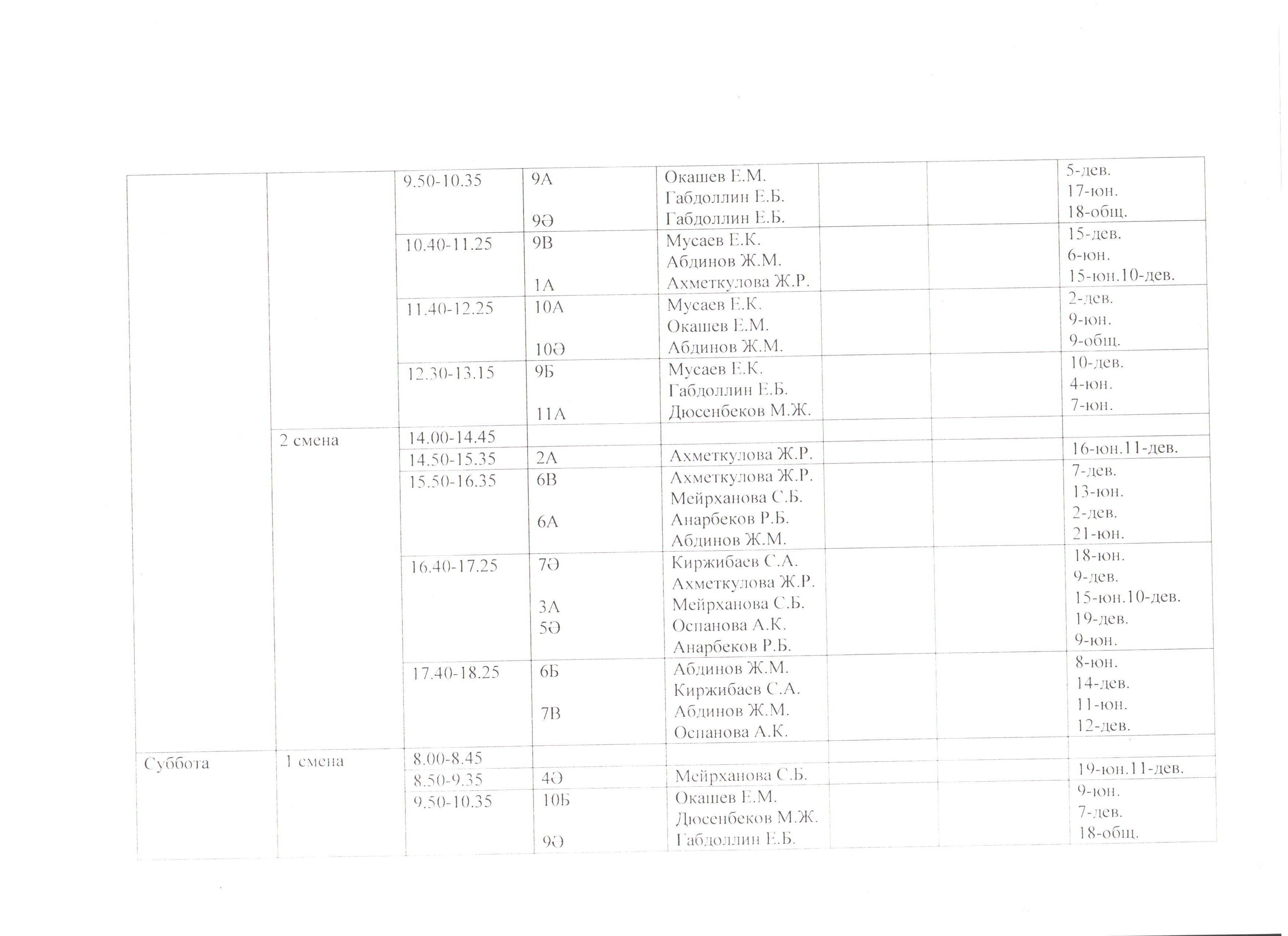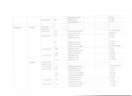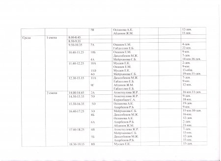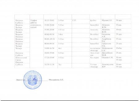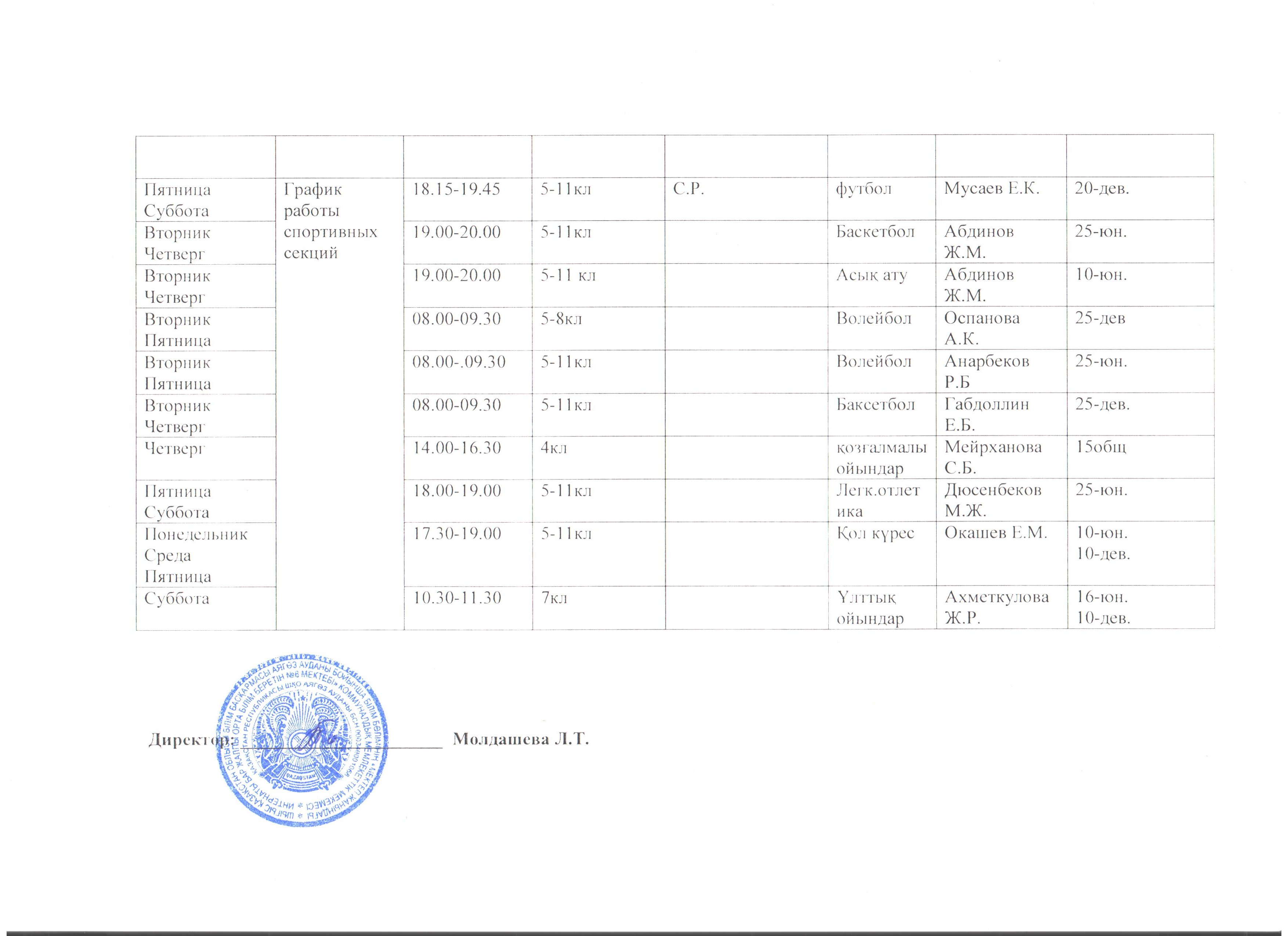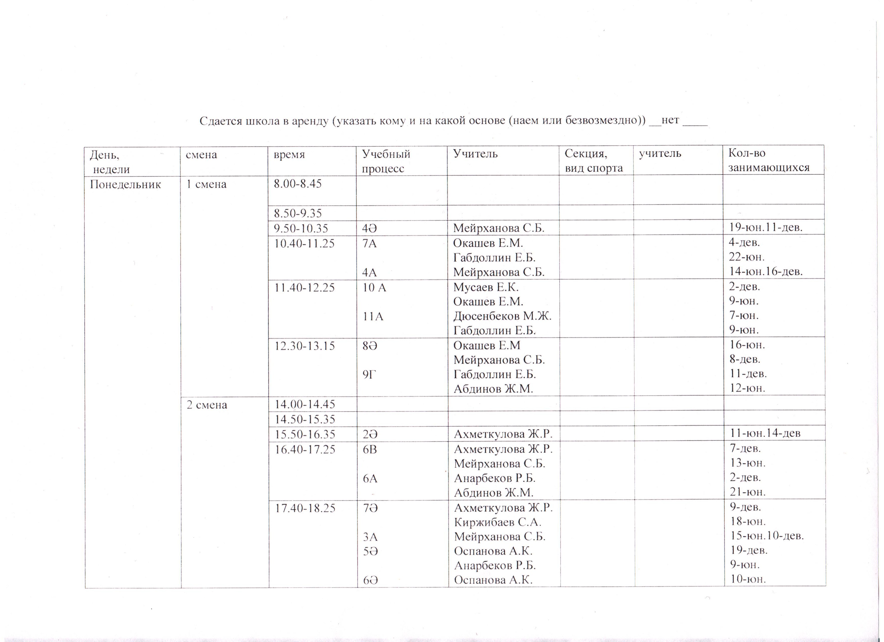 Мектеп сайты » Информация » Шығыс Қазақстан облысы білім басқармасы Аягөз ауданы бойынша білім бөлімінің "Мектеп жанындағы интернаты бар жалпы орта білім беретін #6 мектебі" КММ нің спортзал жұмыс кестесі.