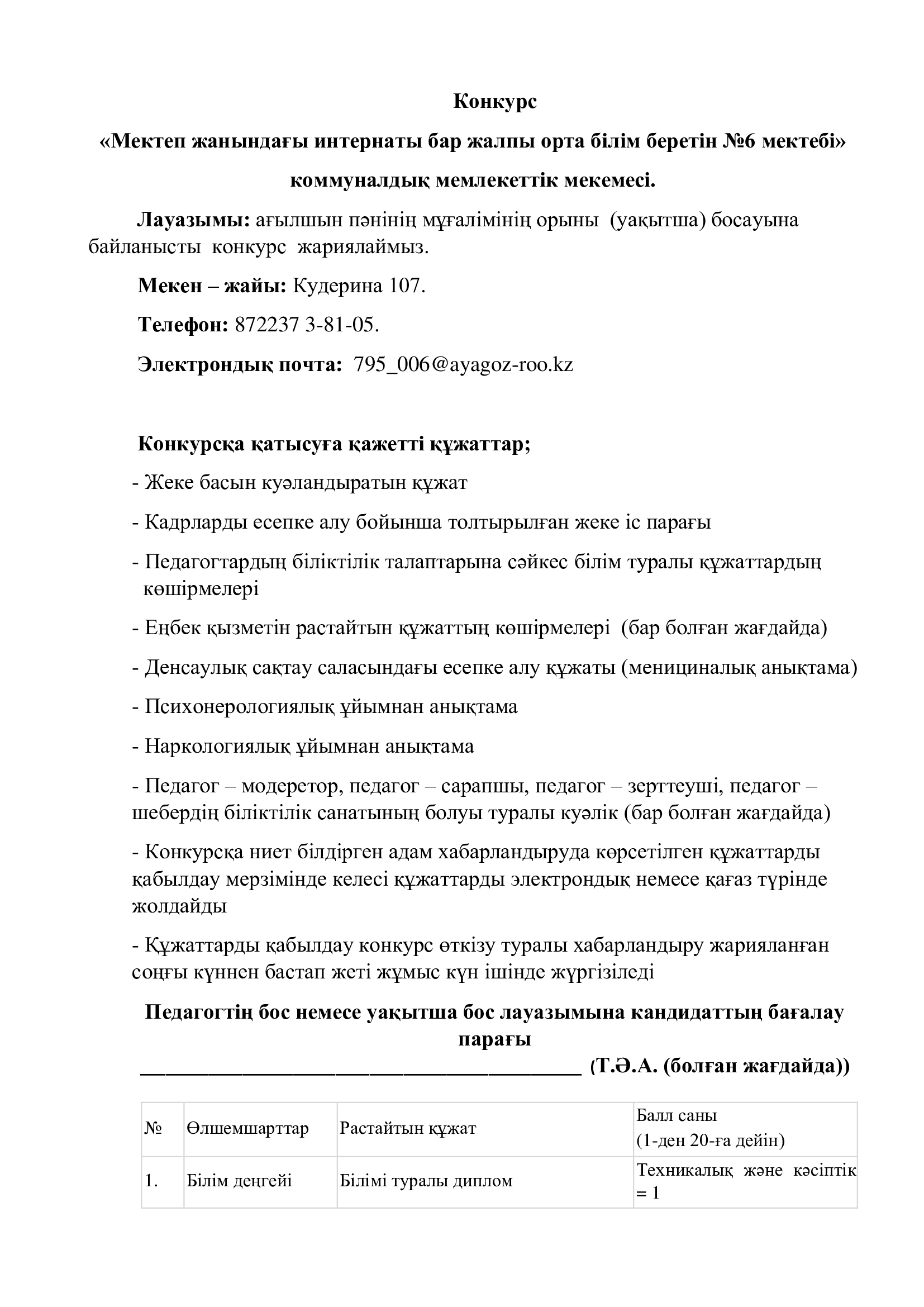 Абай облысы білім басқармасының Аягөз ауданы білім бөлімінің «Мектеп жанындағы интернаты бар жалпы орта білім беретін № 6 мектебі»