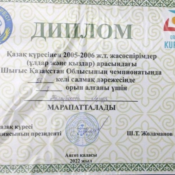 "Мектеп жанындағы интернаты бар жалпы орта білім беретін #6 мектебі" КММ Қазақ күресінен 2005-2006ж.т жасөспірімдер (қыздар және ұлдар) арасындағы Шығыс Қазақстан Облысының чемпионатыда 52 келі салмақ дәрежесінде І орын алғаны үшін 10 "Ә" сынып оқушысы Төлеубекова Ақнұр марапатталды. Жеңісің құтты болсын! Алдағы сайыста жеңіске жетуіңе тілектеспіз!
