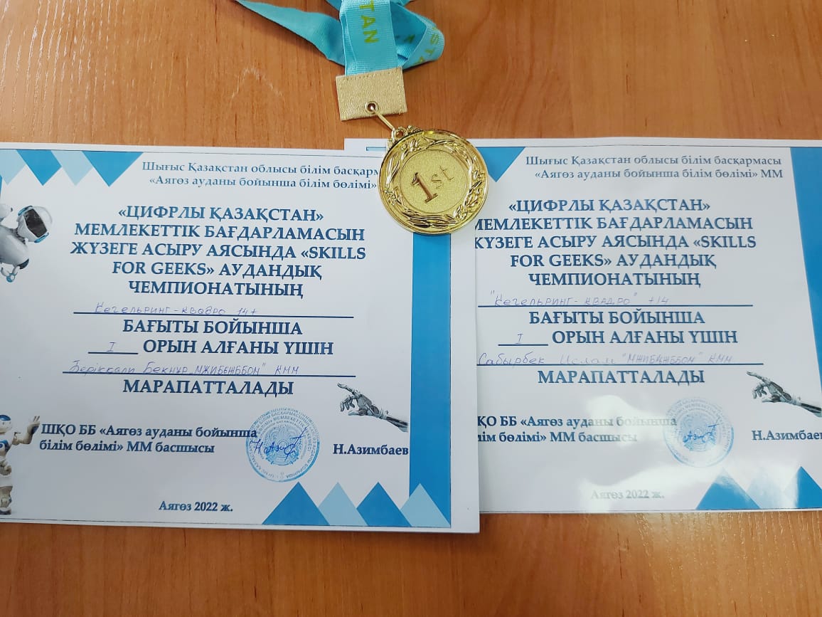 "Цифрлы Қазақстан" мемлекеттік бағдарламасын жүзеге асыру аясында "SKILLS FOR GEEKS" аудандық чемпионатының "Кегельринг - квадро" +14 бағыты бойынша І орын алған үшін мектебіміздің 8 сынып оқушылары Сабырбеков Ислам және Берікқали Бекнұр 🥇🥇🥇🏅🏅🏅"Қара сызық бойынша" 4 сынып оқушысы Ахатжан Нұркелді III орын🥉🥉🥉3Д Моделдеу түрі бойынша сайыста 6 сынып оқушысы Баймагулов Ерасыл III орынмен 🥉🥉🥉марапатталды.