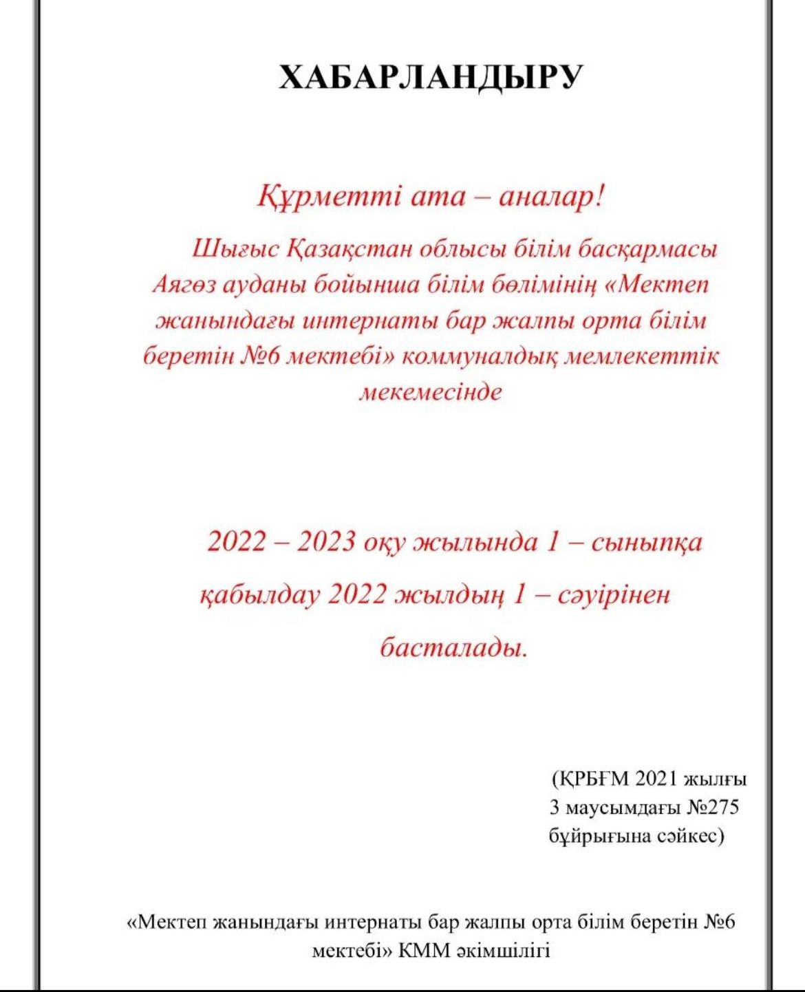 2022 – 2023 оқу жылында 1 – сыныпқа қабылдау