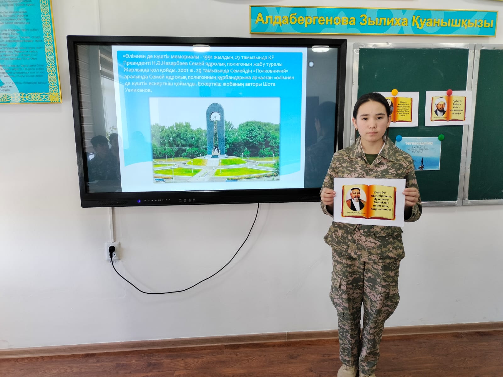 Танымдық сабақ барысында оқушылар Алаш қайраткерлерінің өмірімен танысып, бейнебаяннан үзінді көріп, Семей қаласының тарихы туралы мәлімет, Семей қаласының көрікті жерлері туралы ой қозғады. Алашорда қайраткерлерінің қазақ елдігі үшін еткен ерен еңбегінен ой түйіндеді. Алаш қайраткерлері қазақ қоғамының өміріне белсене араласып көпбағытты саяси істер атқарғандығын білді. Қорыта келгенде, Семейдің атын шығарып,даңқын аспандатқан оқиғалар, Қазақ автономиясының ресми астанасы Семей шаһарының қандай тарихи рөл атқарғанын аңғартатын тағыда бір айғақ болды.