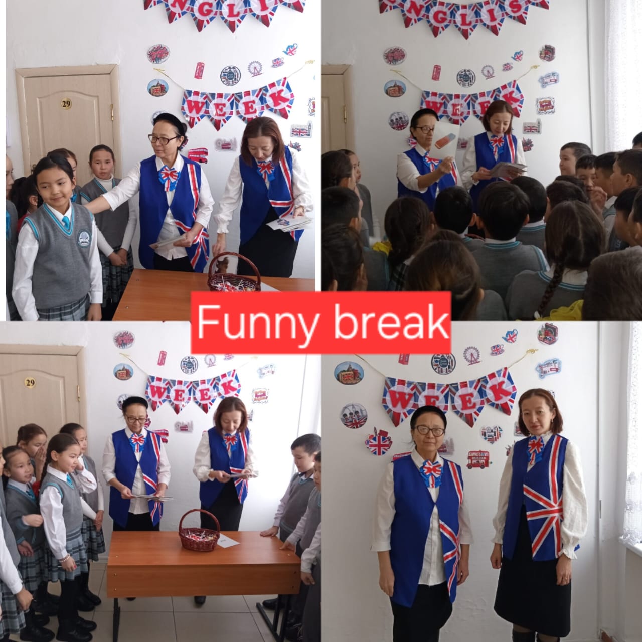 Қаңтар айының 31-ші жұлдызында, ағылшын тілі апталығының аясында пән мұғалімдері М.М Оразгалиева және А.А Мурумбаева бастауыш сынып оқушыларымен үзілісте "Funny break time" өткізді. Оқушылар ағылшын тілінен мақал-мәтел айтып, жұмбақ шешіп, әр-түрлі сұрақтарға жауап беріп тәттілер алды