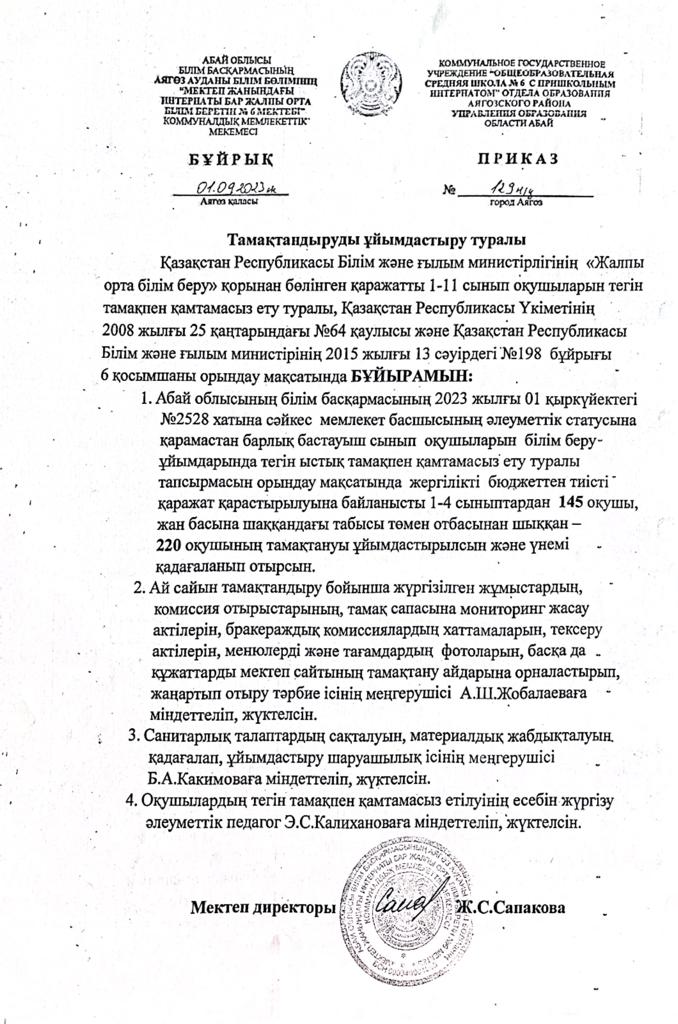 Тамақтандыру ұйымдастыру туралы бұйрық