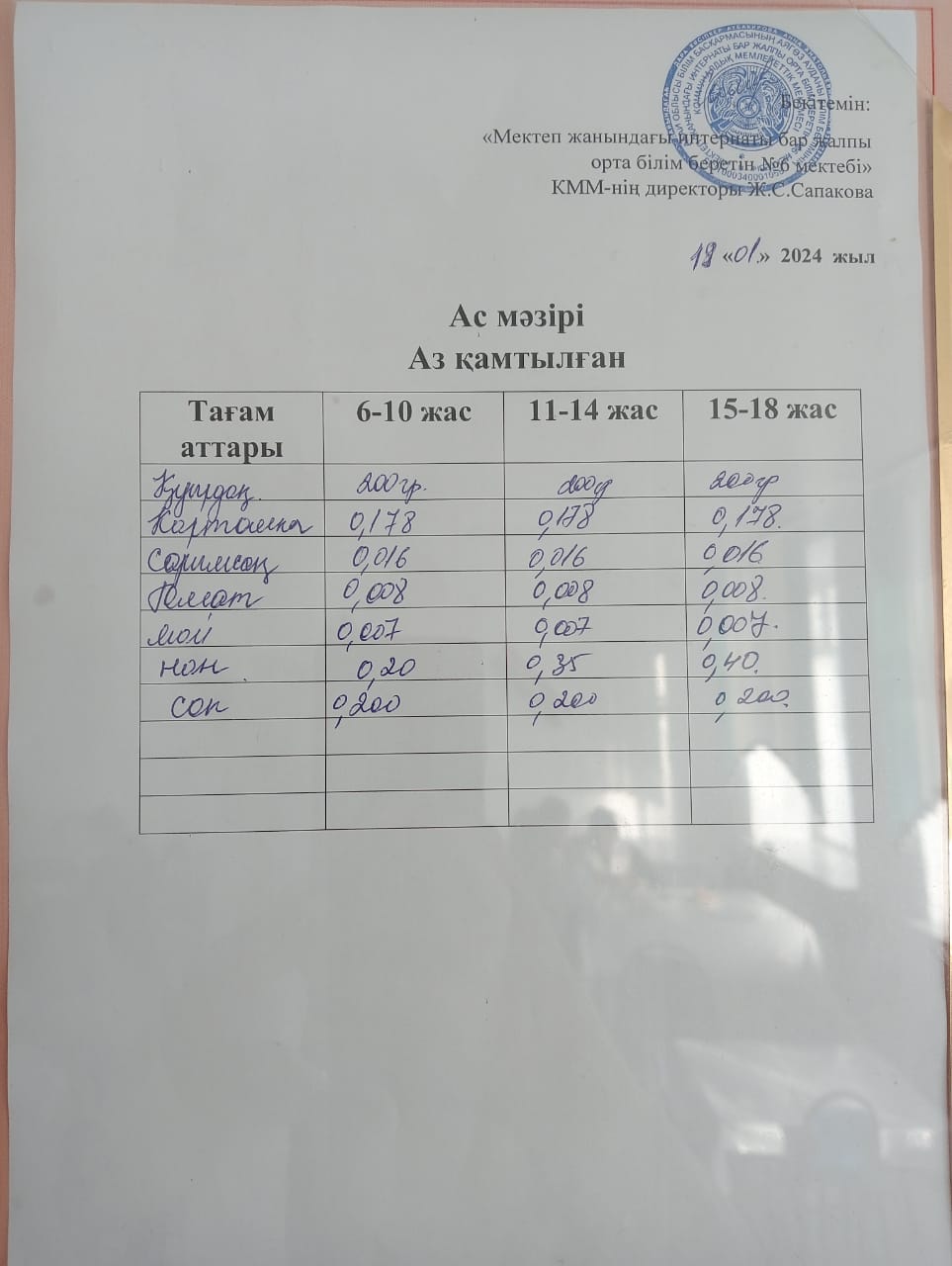 Күн мәзіріне берілетін ыстық тамақ 19.01.2024ж