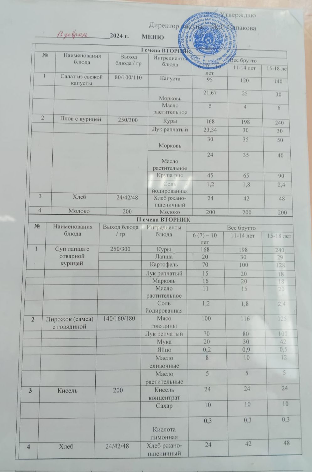 Күн мәзіріне берілетін ыстық тамақ 13.02.2024ж