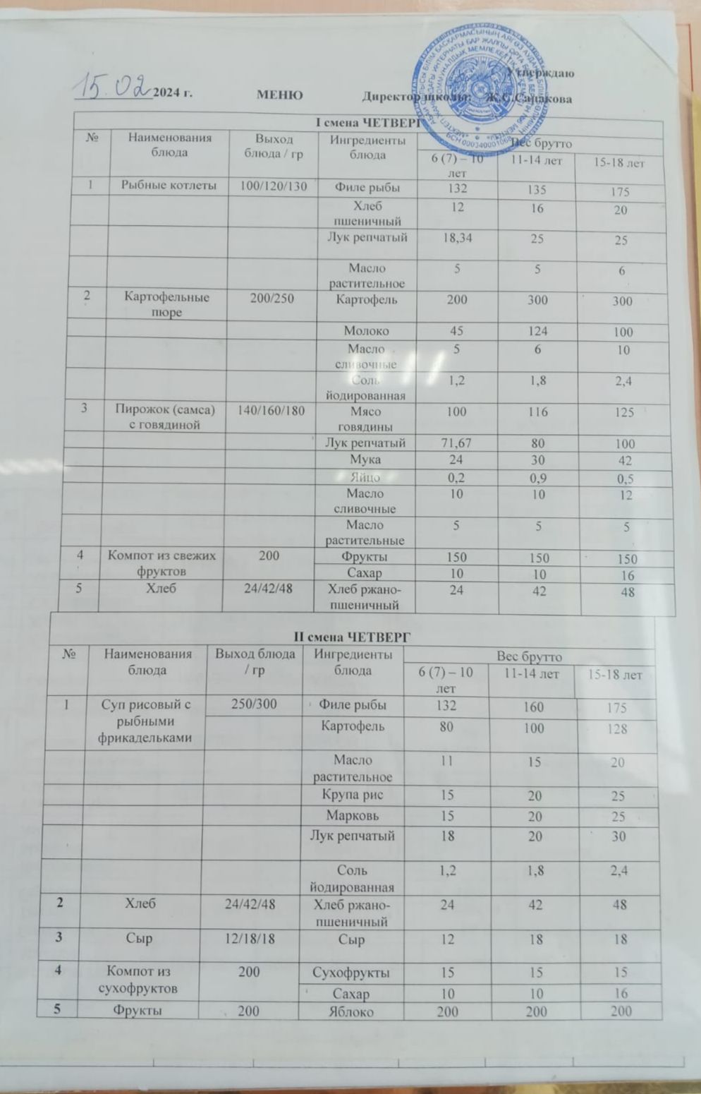 Күн мәзіріне берілетін ыстық тамақ 15.02.2024ж