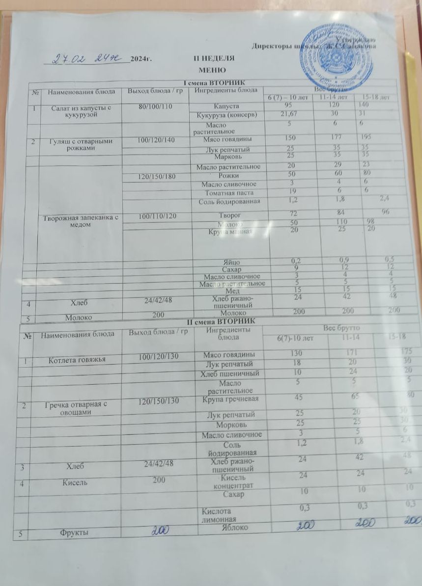 Күн мәзіріне берілетін ыстық тамақ 27.02.2024ж
