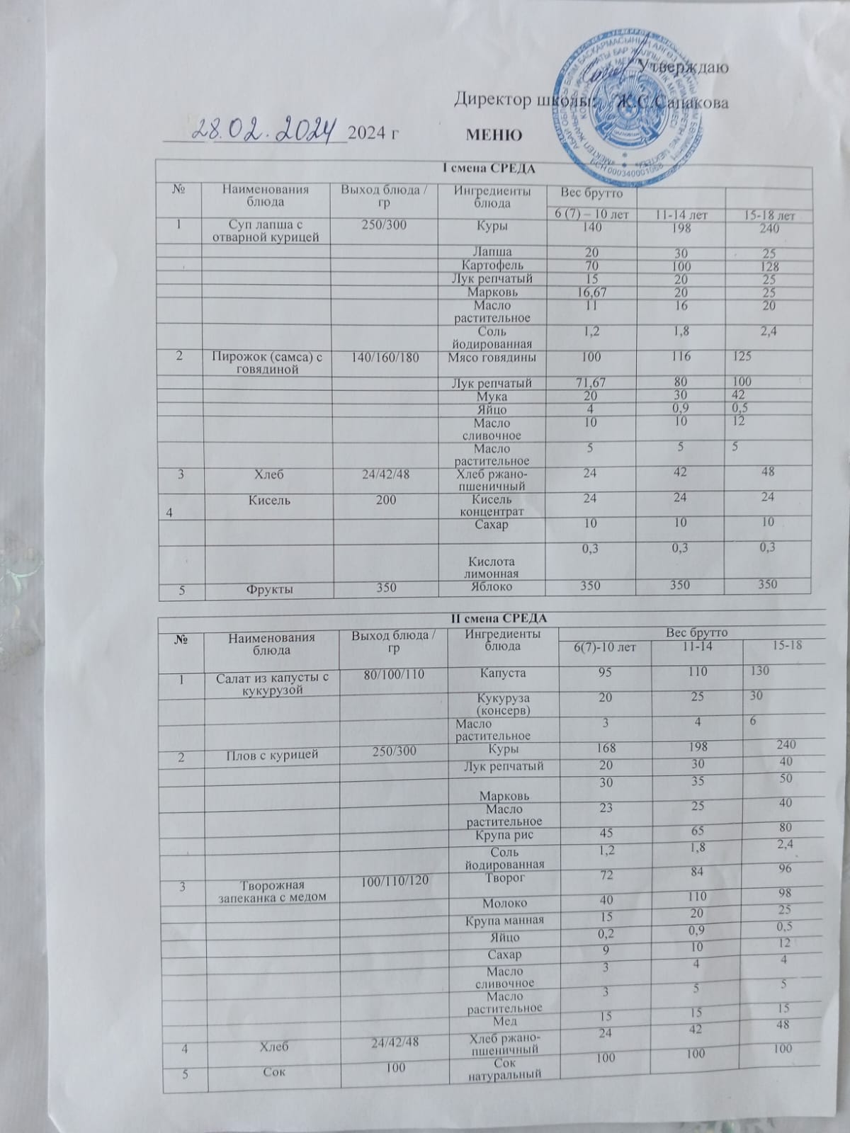 Күн мәзіріне берілетін ыстық тамақ 28.02.2024ж