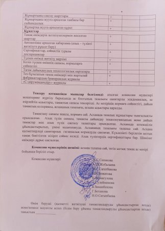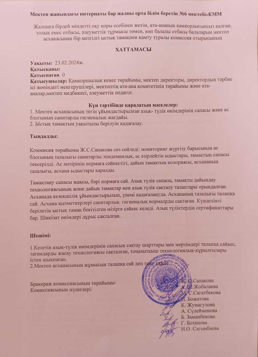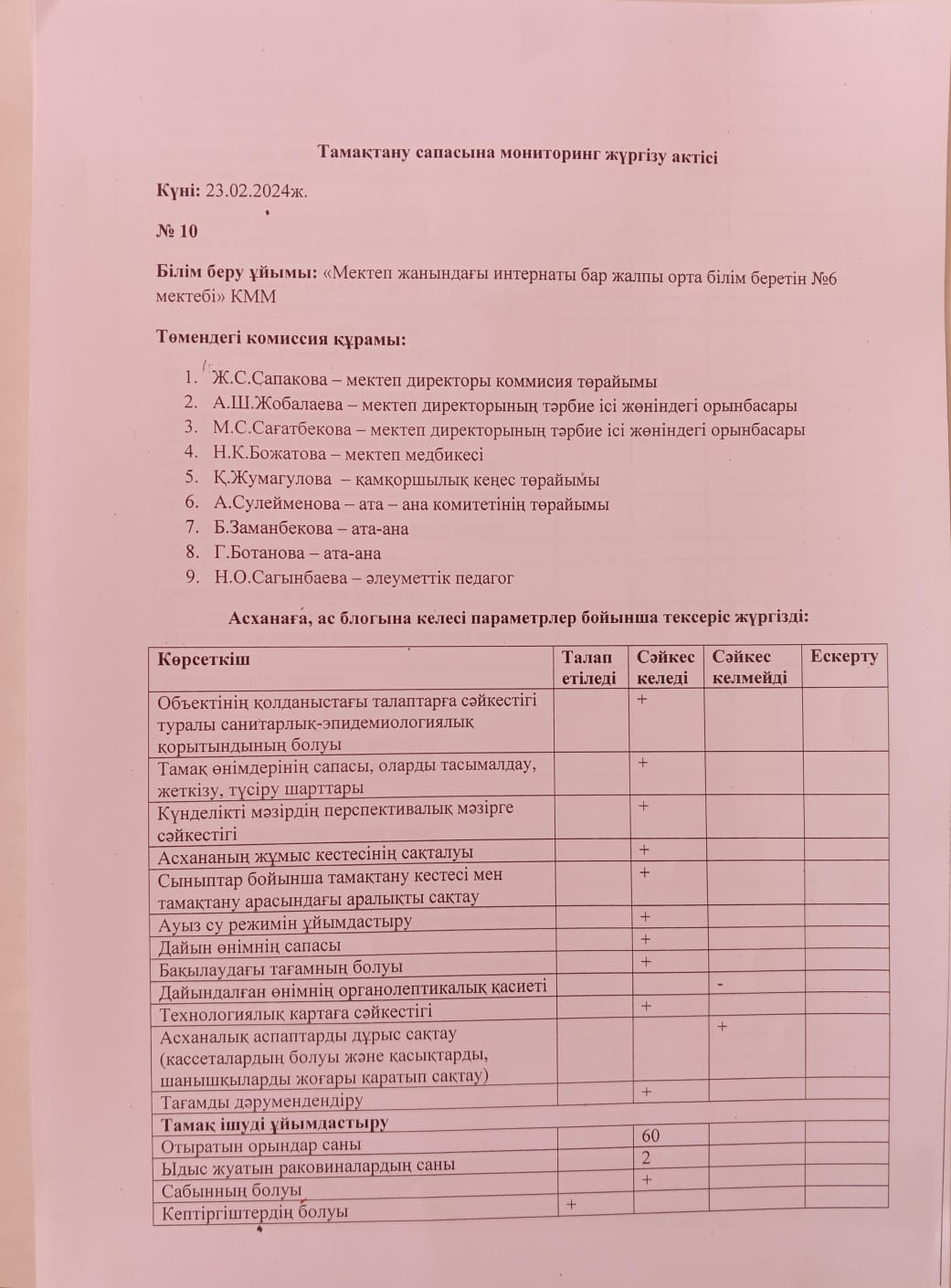 Тамақтану сапасына мониторинг актісі.Хаттамасы