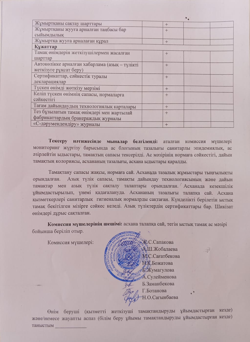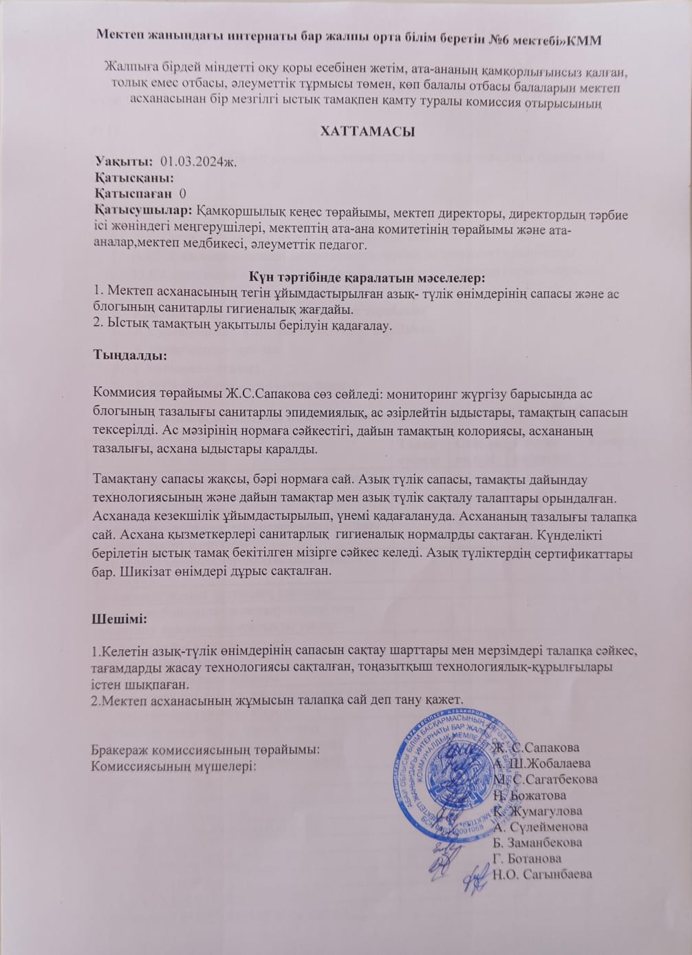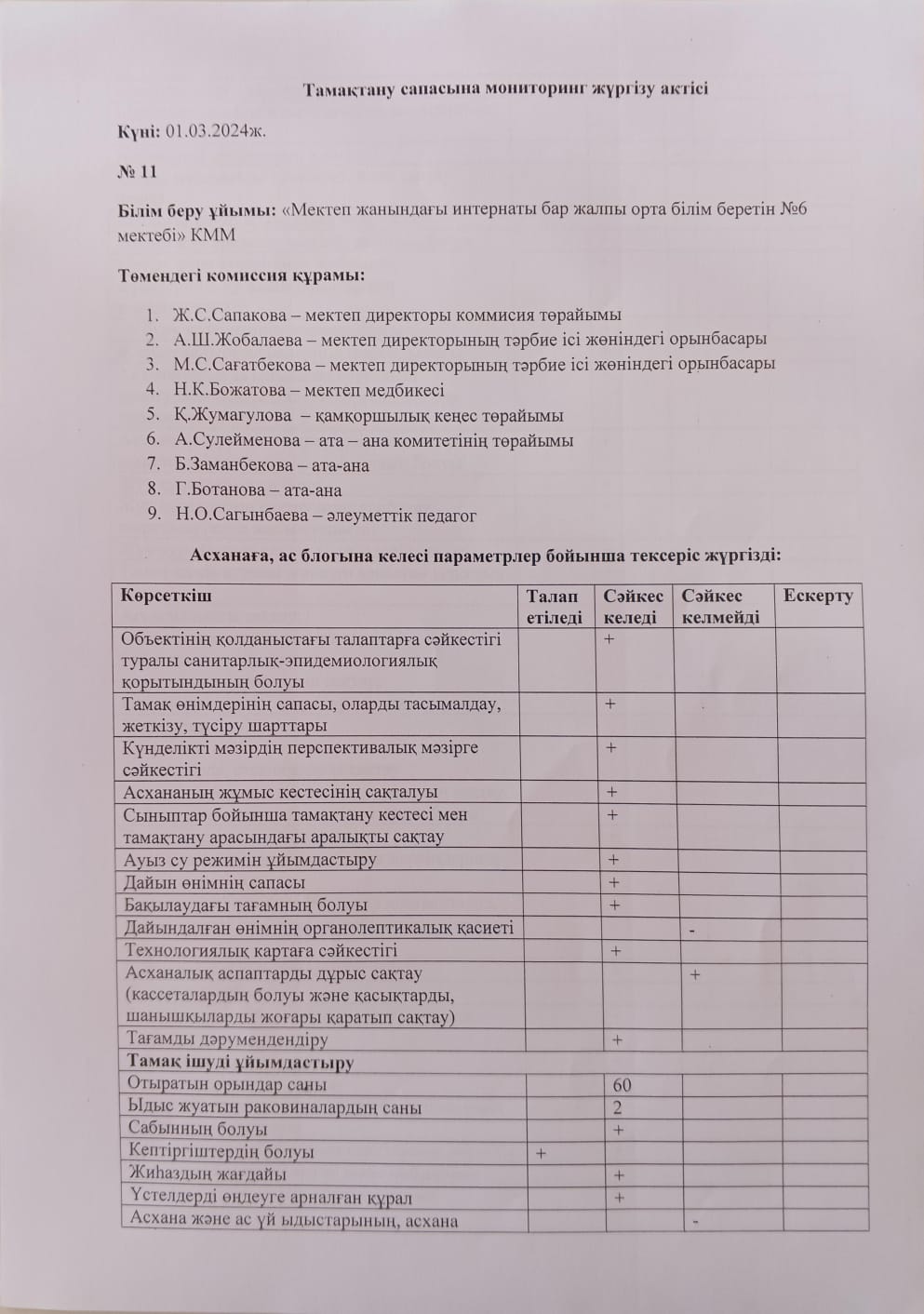 Тамақтану сапасына мониторинг актісі.Хаттамасы