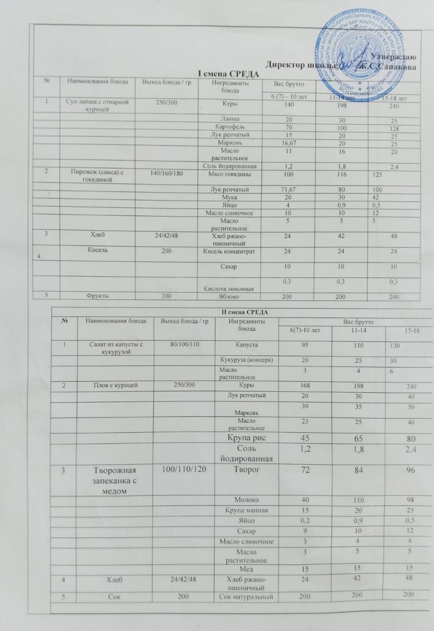 Күн мәзіріне берілетін ыстық тамақ 13.03.2024ж