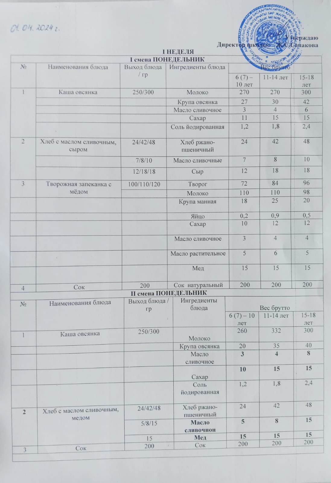 Күн мәзіріне берілетін ыстық тамақ 01.04.2024ж