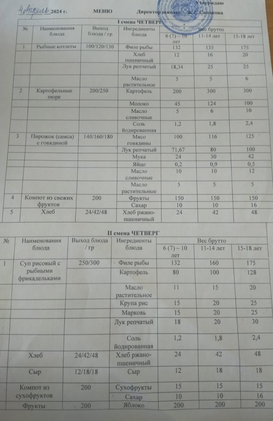 Күн мәзіріне берілетін ыстық тамақ 04.04.2024ж