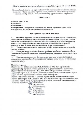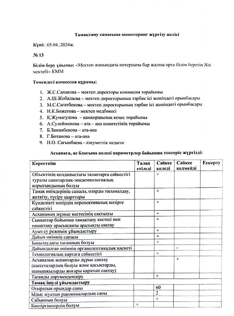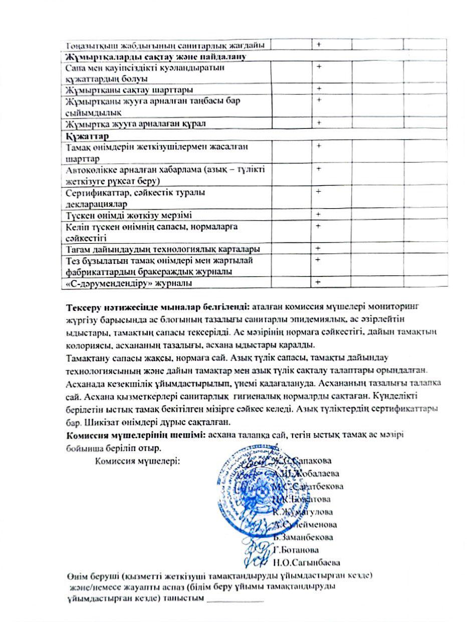 Тамақтану сапасына мониторинг актісі.Хаттамасы