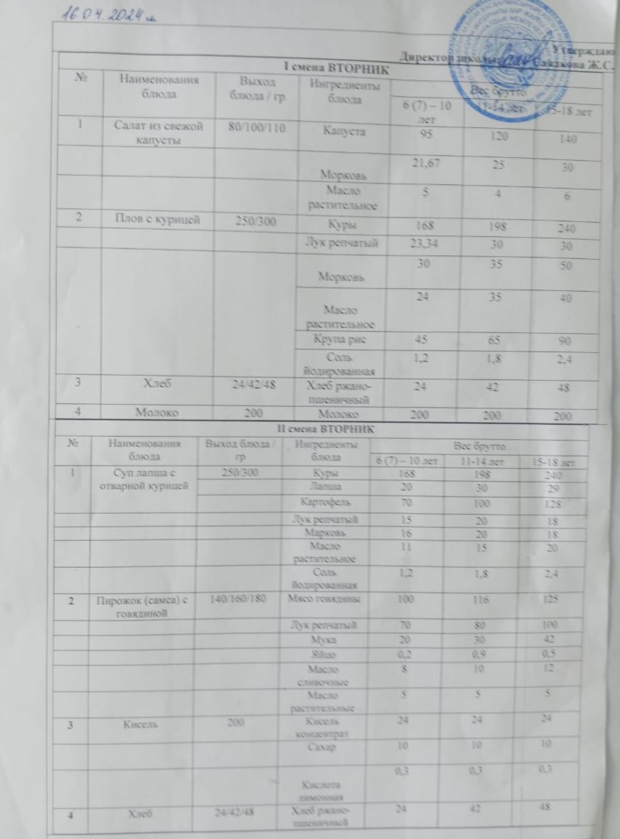 Күн мәзіріне берілетін ыстық тамақ 16.04.2024