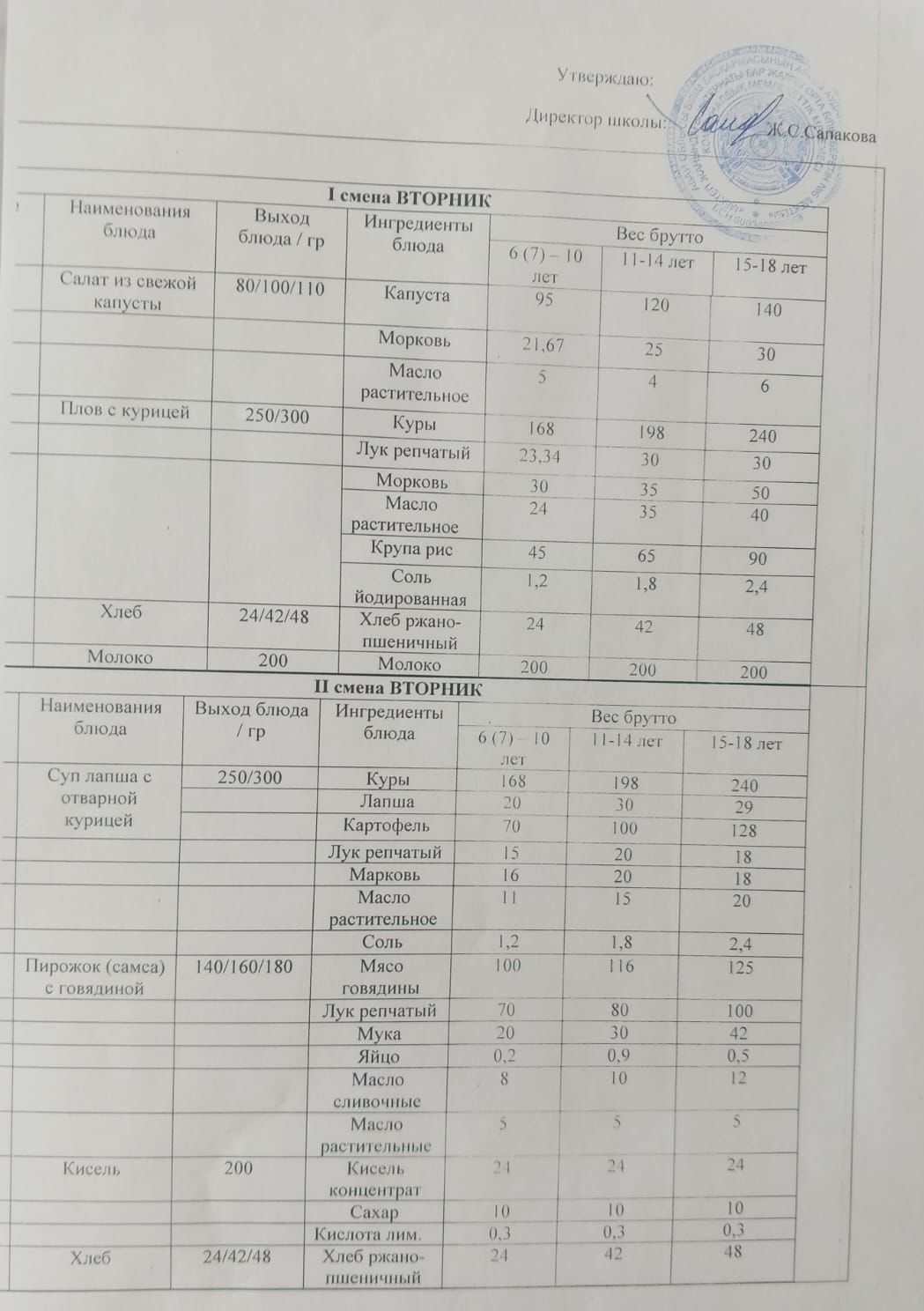 Күн мәзіріне берілетін ыстық тамақ 14.05.2024ж