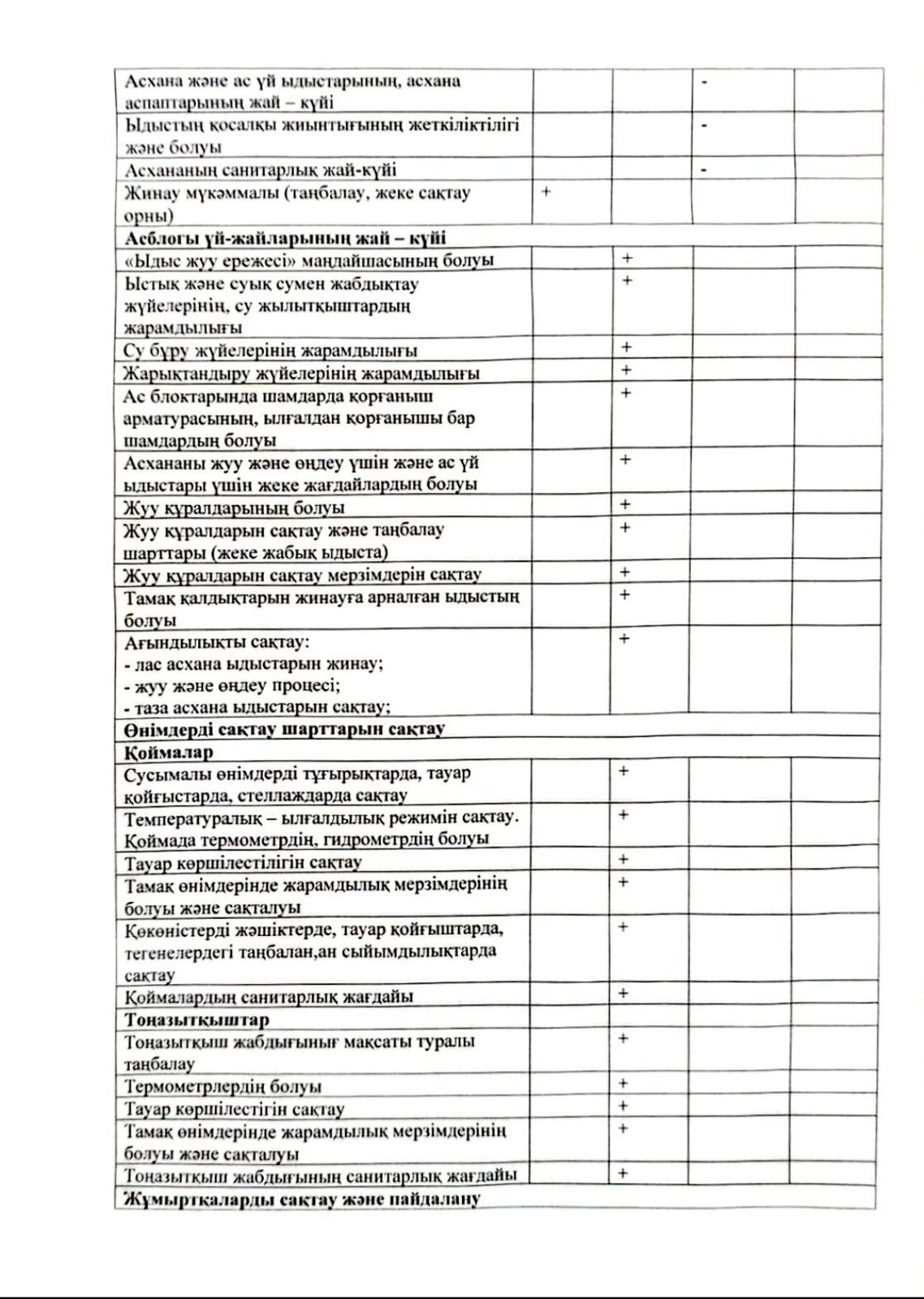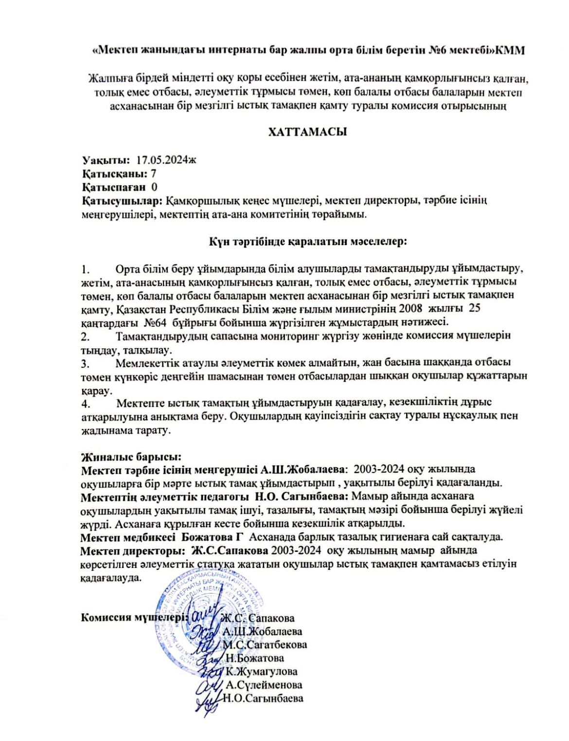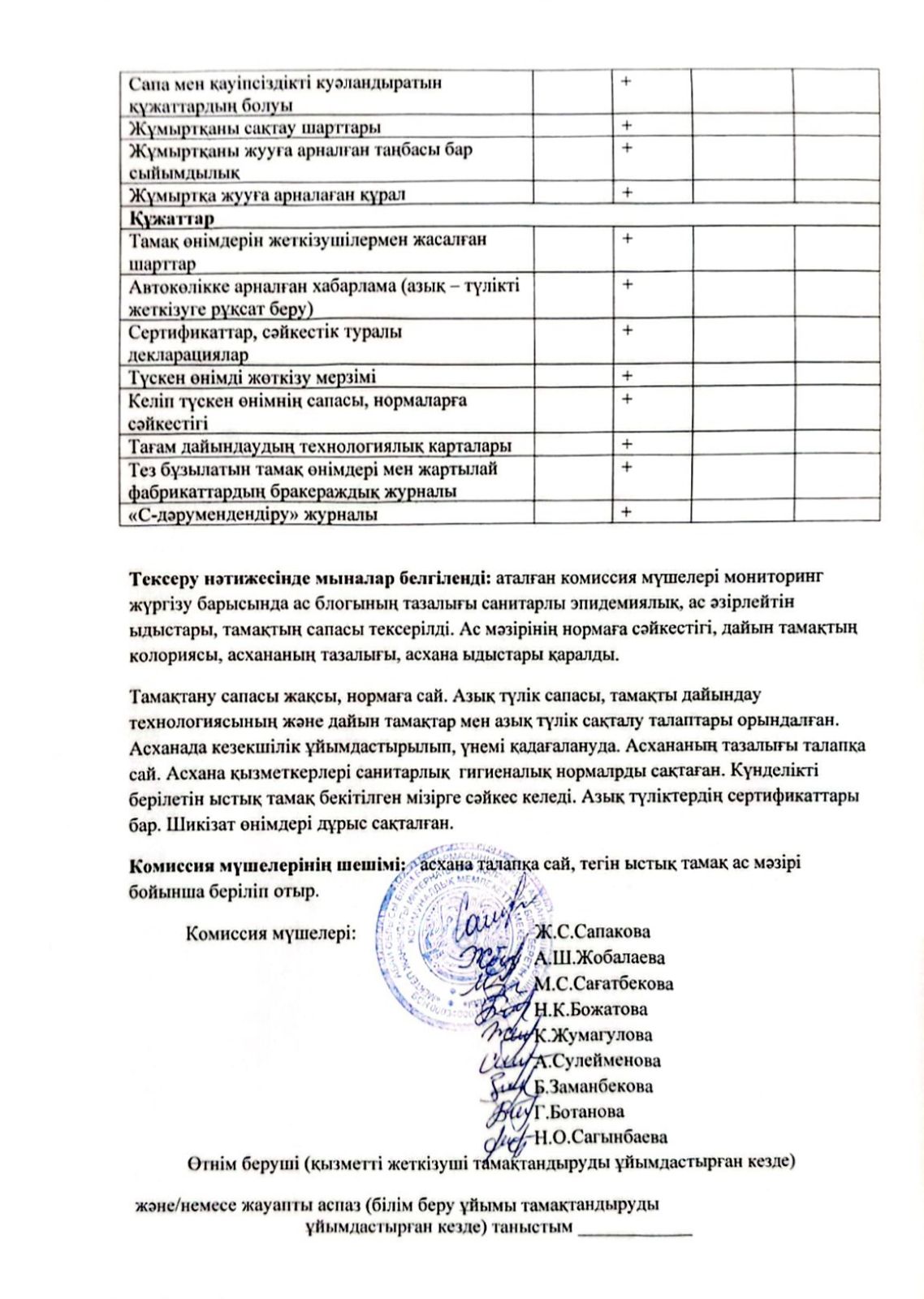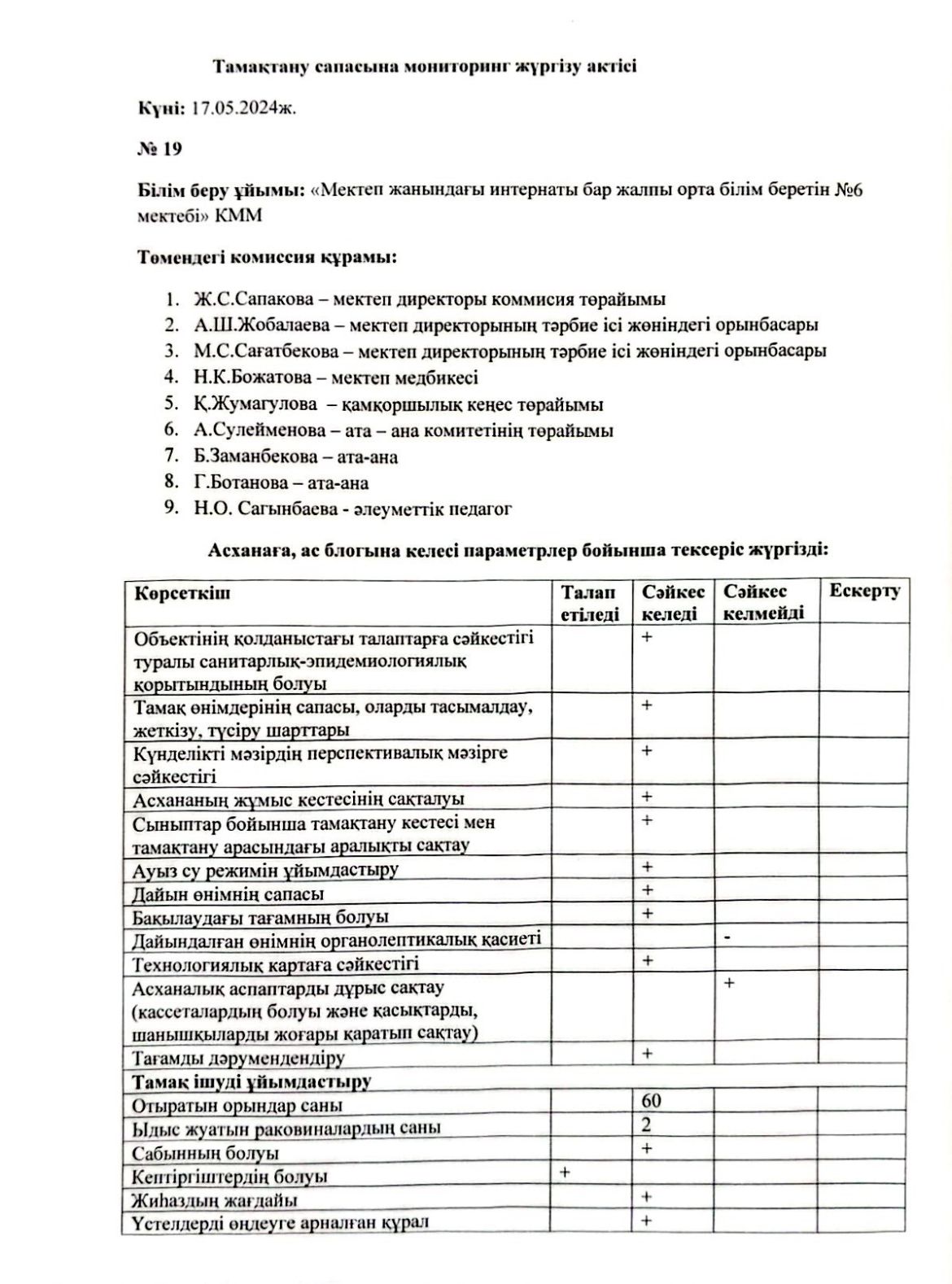 Тамақтану сапасына мониторинг актісі.Хаттамасы
