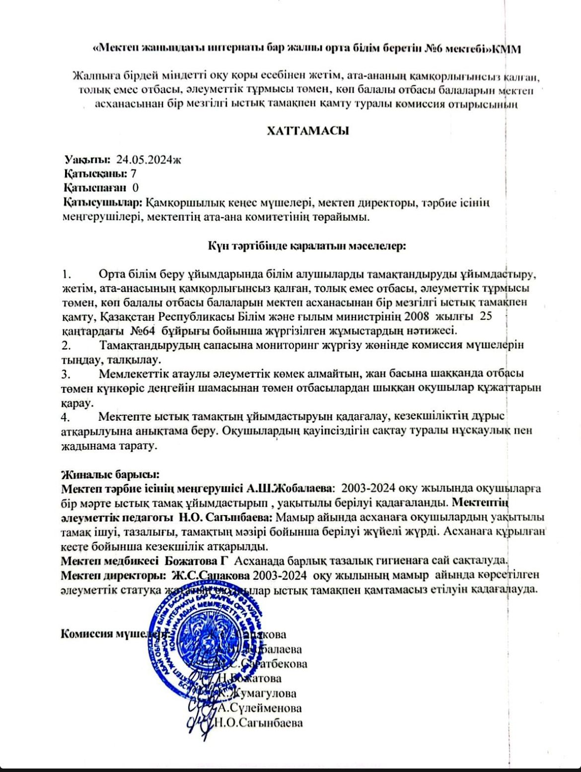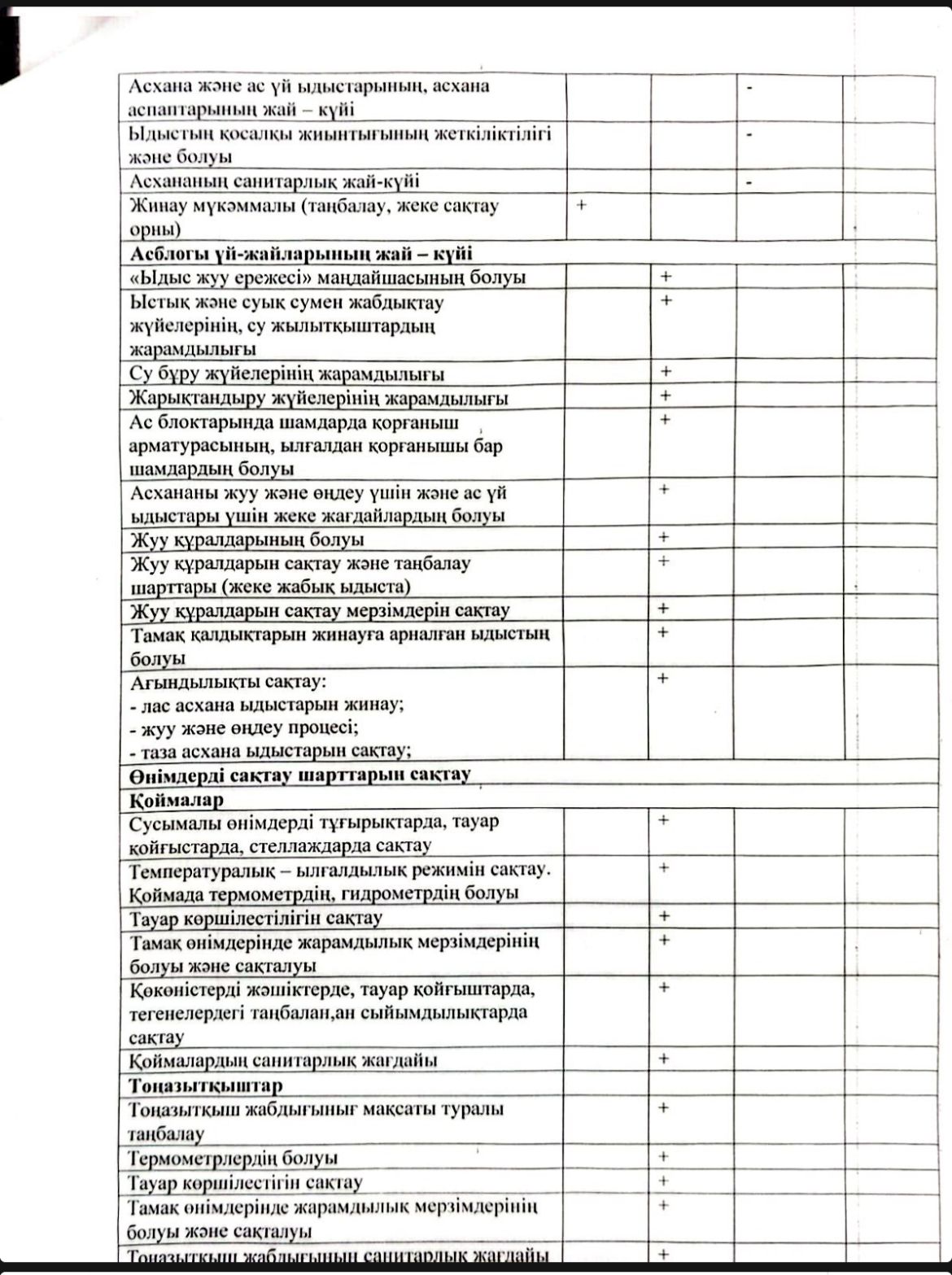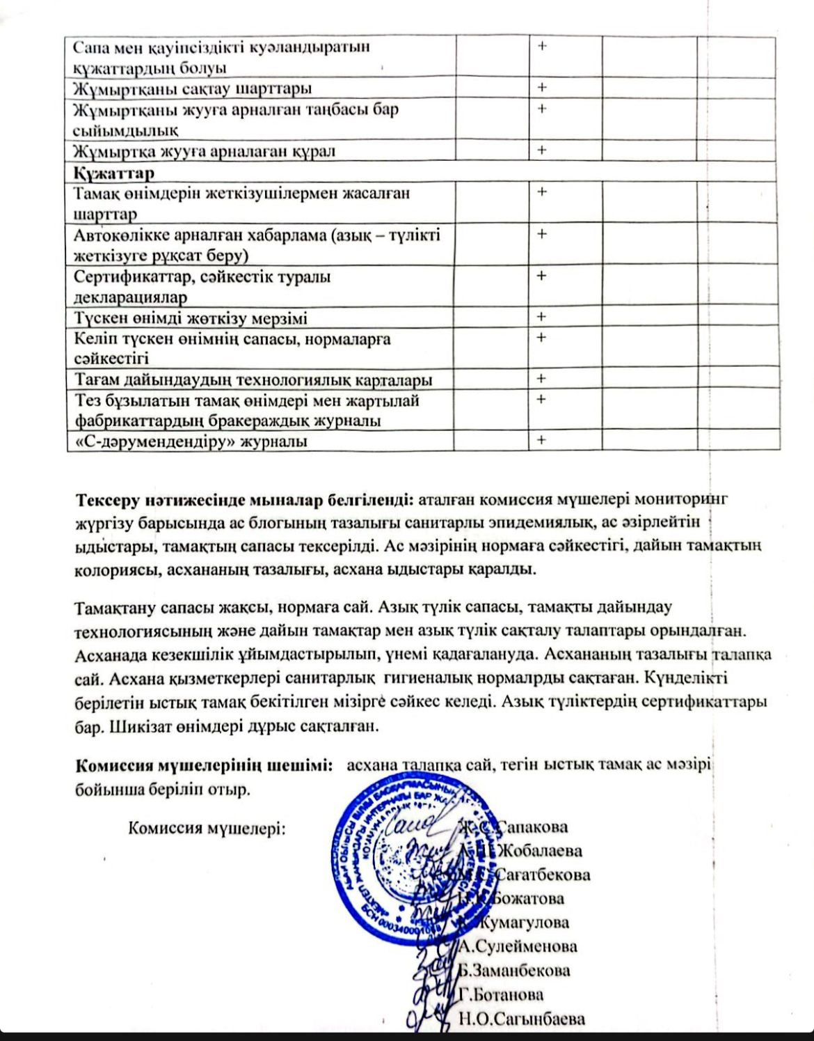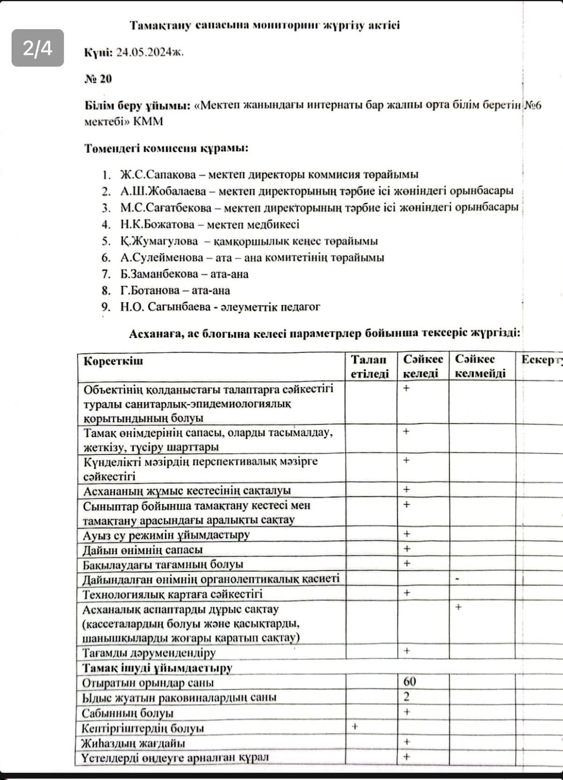 Тамақтану сапасының мониторинг жүргізу актісі.Хаттамасы