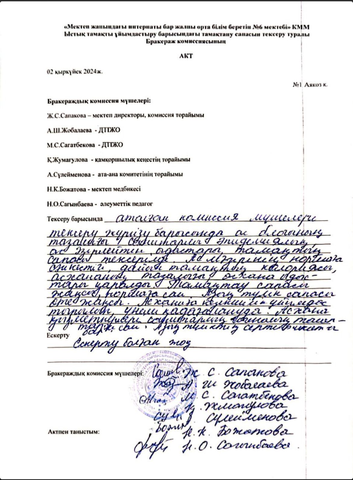 » Ыстық тамақты ұйымдастыру барысындағы тамақтану сапасын тексеру туралы Бракераж комиссиясының АКТ