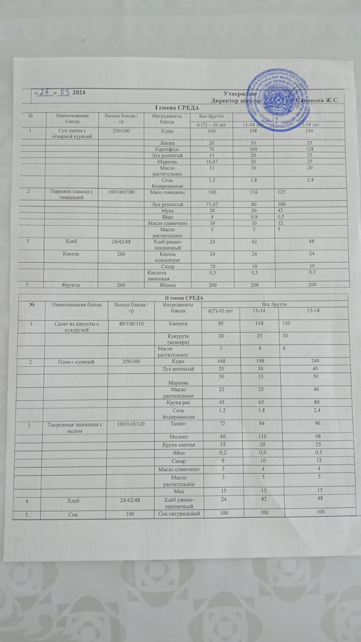 Күн мәзіріне берілетін ыстық тамақ 25.09.2024