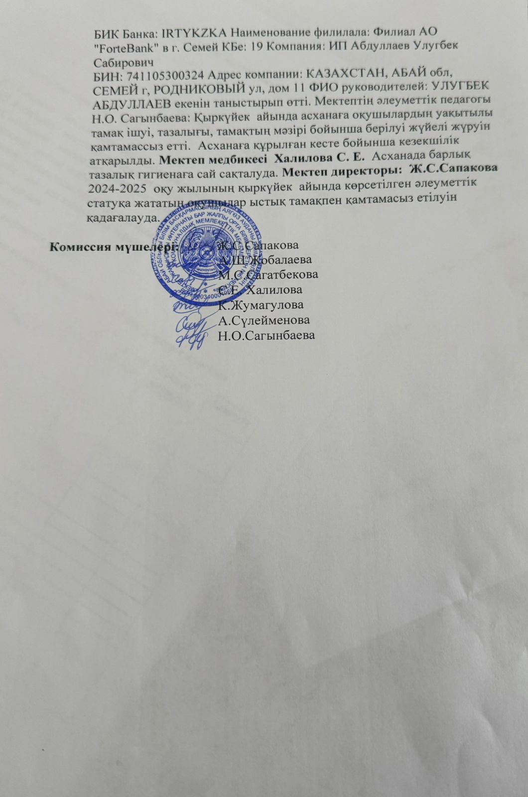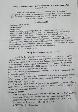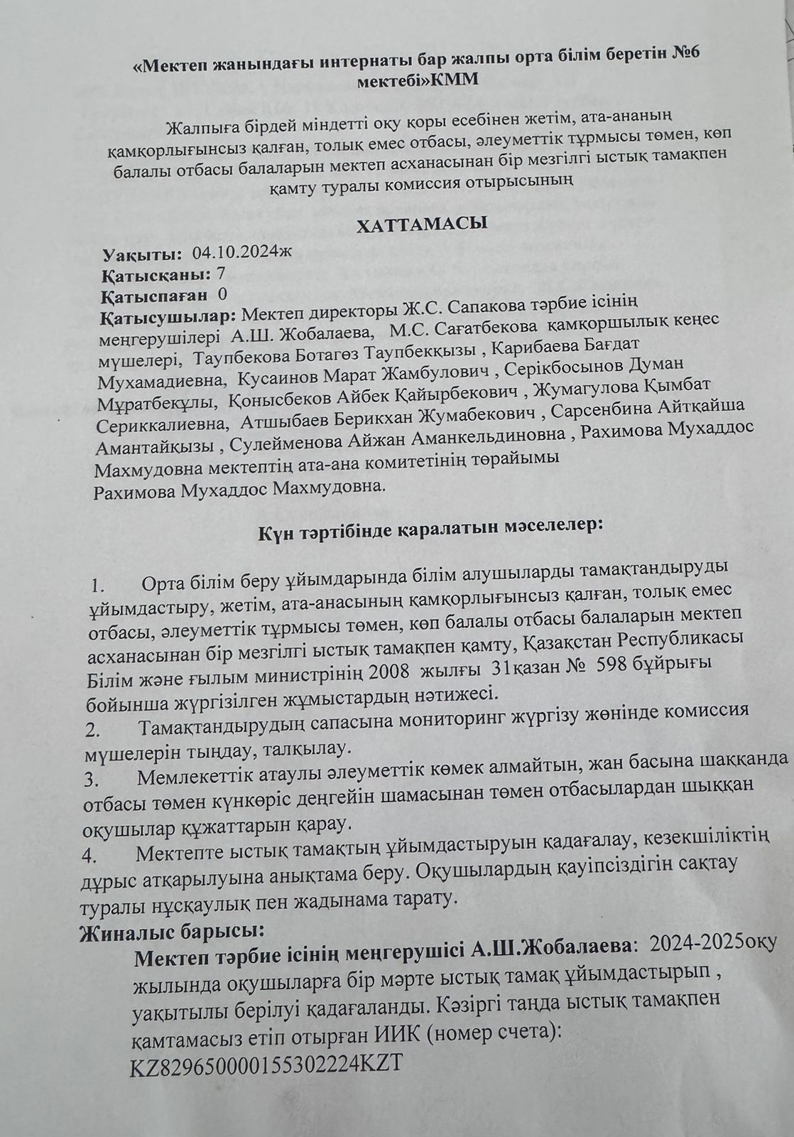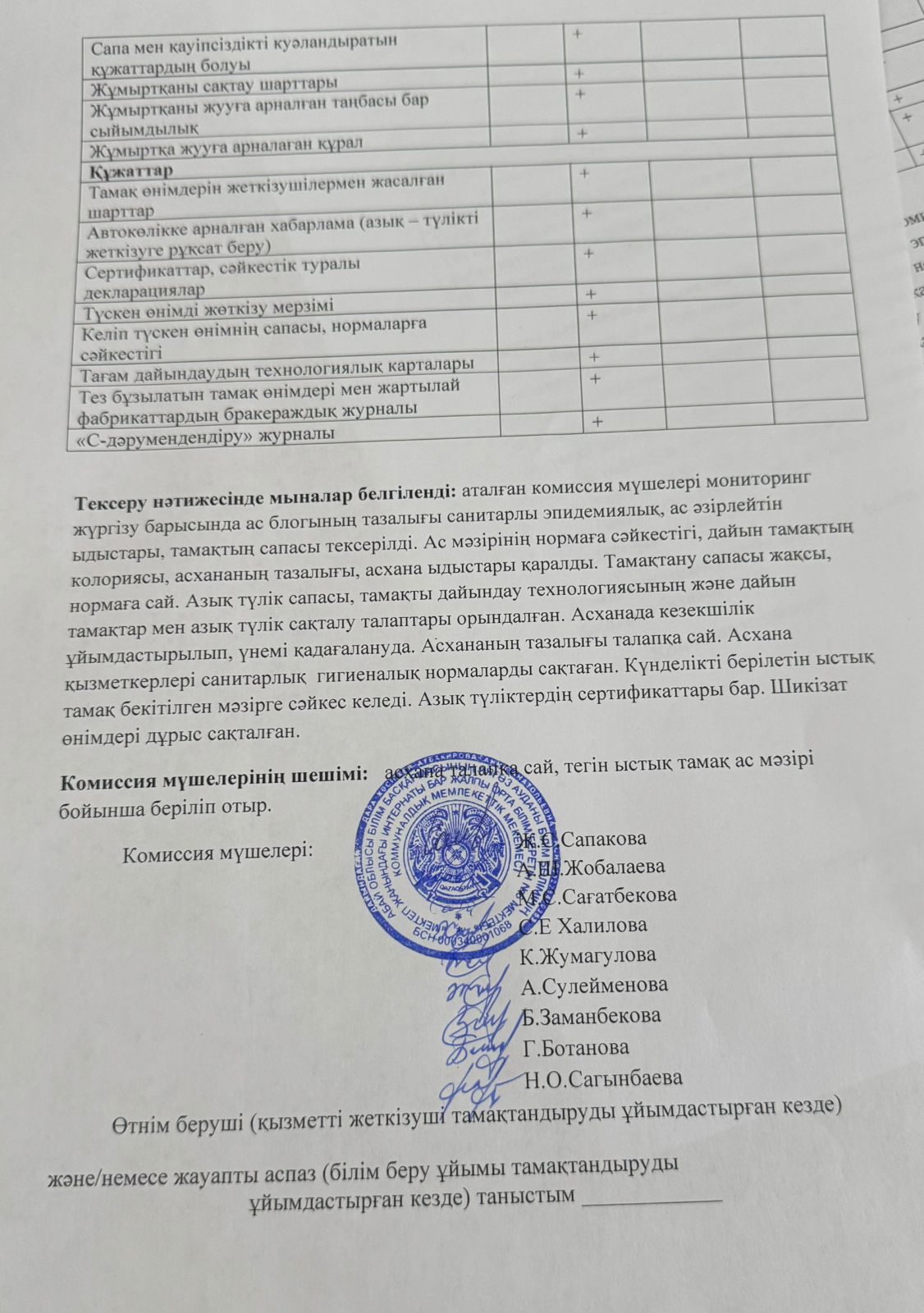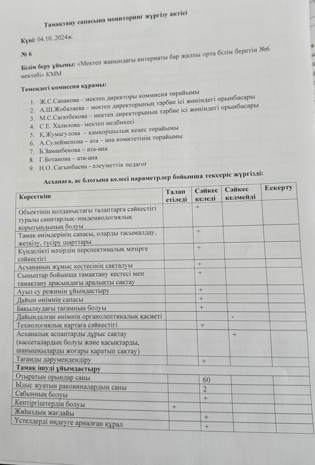 Тамақтану сапасының мониторинг жүргізу актісі.Хаттамасы