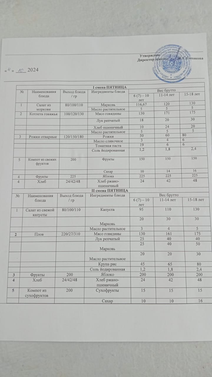 Күн мәзіріне берілетін ыстық тамақ 04.10.2024