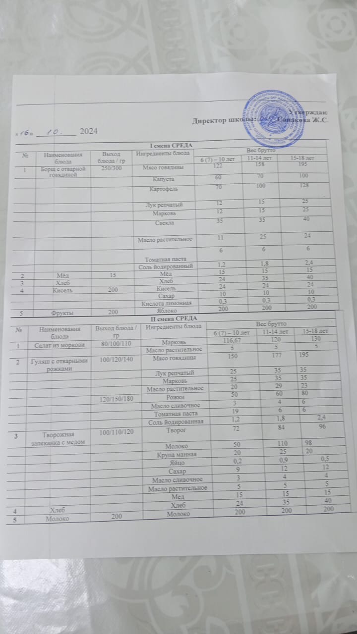 Күн мәзіріне берілетін ыстық тамақ 16.10.2024
