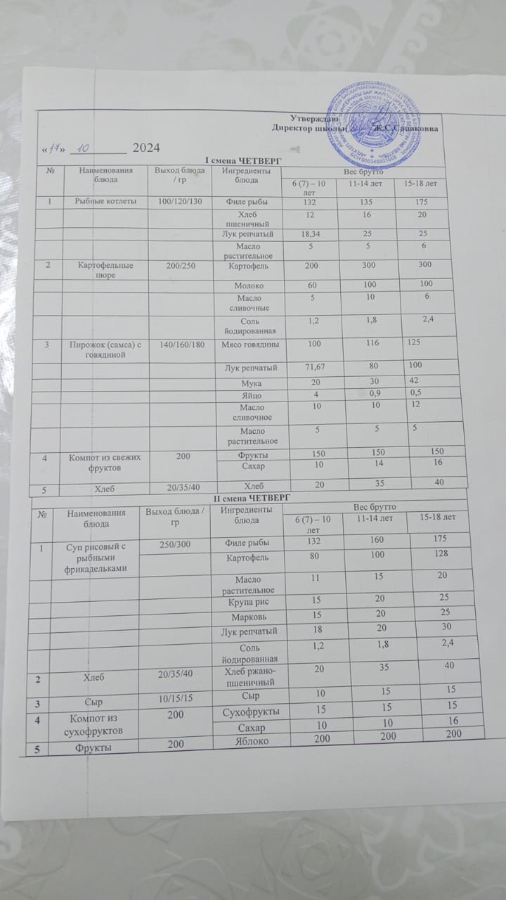 Күн мәзіріне берілетін ыстық тамақ 17.10.2024