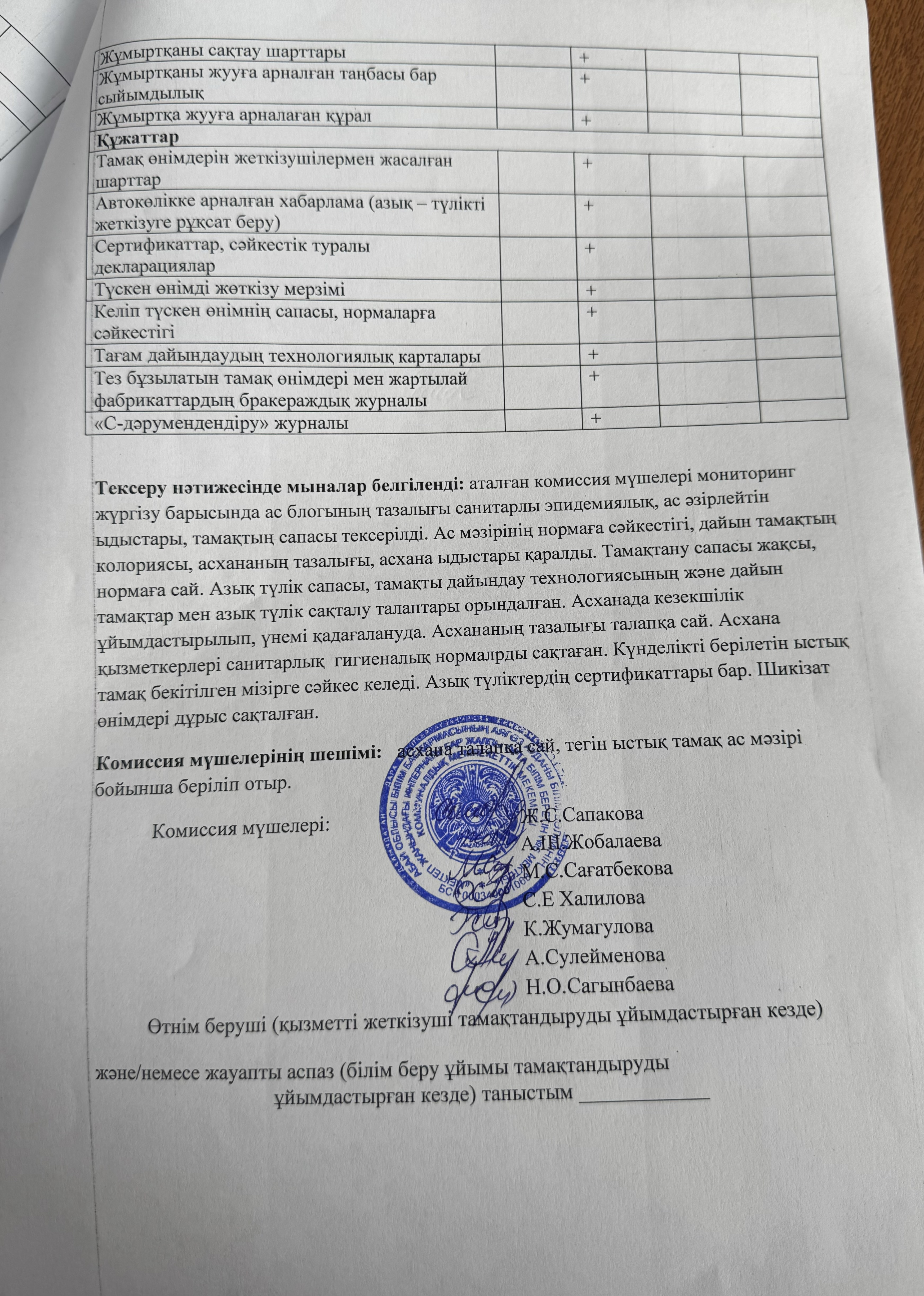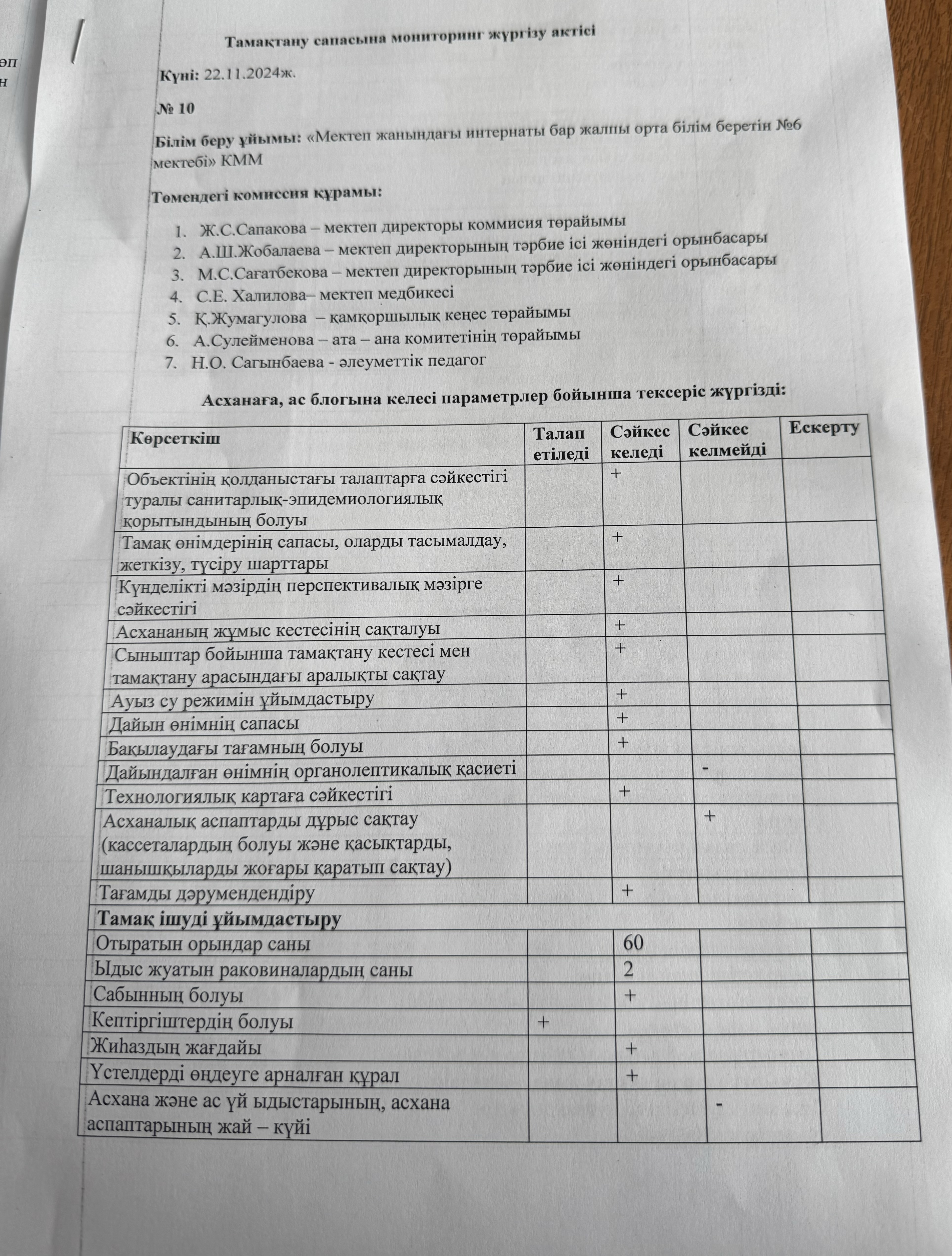 Тамақтану сапасының мониторинг жүргізу актісі.Хаттамасы