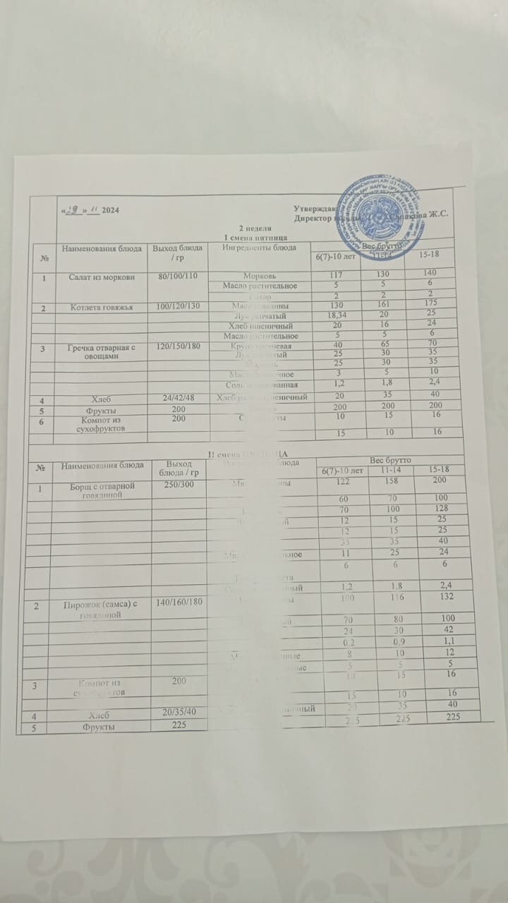 Күн мәзіріне берілетін ыстық тамақ 29.11.2024